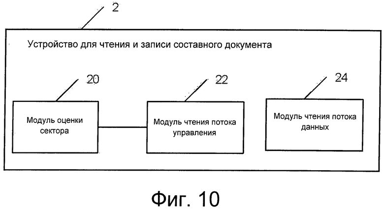 первый модуль 10 предварительного выделения памяти для потока управления, предназначенный для предварительного выделения начальной области памяти для внутреннего потока управления составного документа, причем начальная область памяти состоит из непрерывных секторов или кластеров секторов;