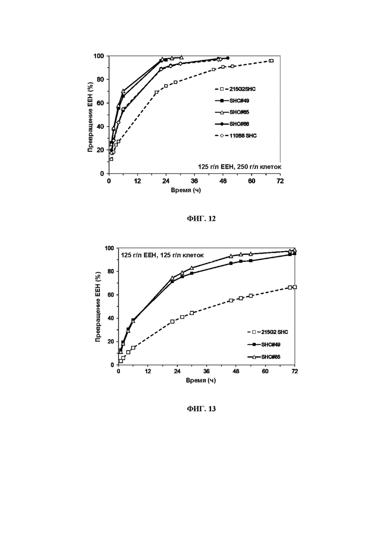 На Фиг. 14 показано превращение ЕЕН в (-)-амброкс вариантом SHC №65 фермента SHC/HAC в оптимальных условиях по сравнению с родительским ферментом SHC/HAC 215G2. Реакции проводили при от 125 г/л до 300 г/л ЕЕН и либо при 250 г/л биокатализатора, либо при отношении [ЕЕН]:[клетки] 1. SDS поставляли при постоянном отношении [SDS]:[клетки] 0,052. Реакции проводили в условиях Т и рН, определенных как оптимальные для варианта SHC SHC №65.