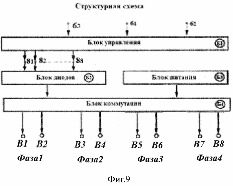 На рисунке фиг. 9 показаны четыре блока - Б1, Б2, Б3, Б4. Блок Б1 - это блок управления. При помощи блока генерируется периодическая последовательность прямоугольных импульсов с заданной или управляемой частотой. Формируемая блоком Б1 последовательность импульсов используется для формирования последовательности управляющих импульсов, при помощи которых осуществляется открытие силовых ключей, расположенных в блоке Б4. При помощи силовых ключей формируются последовательности импульсов, составляющих напряжения фаз многофазной системы. С выходов 81…88 этого блока управляющие импульсы поступают на вход блока диодов Б2. При помощи этого блока осуществляется разделение импульсов с положительными и отрицательными амплитудами. Сформированные блоком Б2 импульсы управляют силовыми ключами, расположенными в блоке Б4. На входы силовых ключей поступают напряжения величиной Е или -Е от блока питания Б3. Прямоугольные импульсы, с амплитудами, заданными блоком Б3, длительностью и расположением на временной оси, заданными блоками Б1 и Б2, суммируются блоком коммутации Б4. Сформированное ступенчатое напряжение снимается с полюсов В1 (фаза 1) …В4 (фаза 4).