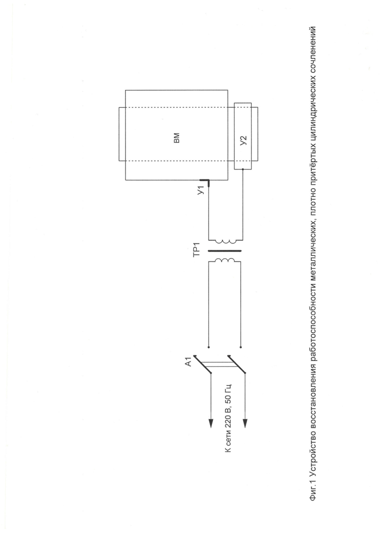 Способ восстановления работоспособности металлических плотно притёртых цилиндрических сочленений, характеризующийся тем, что к сети переменного тока напряжением 220 В, 50 Гц через автоматический выключатель (А1) присоединяют первичную обмотку силового трансформатора (ТР1), вторичную обмотку силового трансформатора, выполненную двумя витками медного изолированного провода сечением не менее 140 мм2, например четыре провода по 35 мм2, причем провод вторичной обмотки присоединяют при помощи контактирующего устройства (У1) к неподвижной части восстанавливаемого механизма (ВМ), второй провод вторичной обмотки присоединяют при помощи контактирующего устройства (У2) к подвижной части восстанавливаемого механизма, обеспечивая при этом контур с переменным током короткого замыкания, в процессе его воздействия происходит нагрев и разрушение коррозирующего слоя сочленяющихся поверхностей и восстанавливается линейное перемещение.