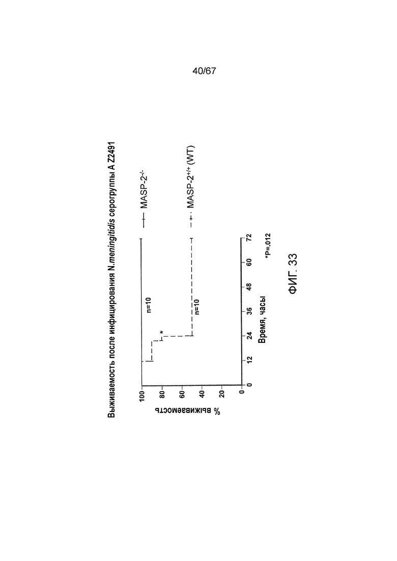 На фиг.33 представлен график Каплана-Мейера, графически иллюстрирующий процентную выживаемость мышей MASP-2 KO и WT после введения инфекционной дозы 2,6×107 к.о.е. N. meningitidis серогруппы A Z2491, демонстрирующий, что мыши с дефицитом MASP-2 защищены от индуцируемой N. meningitidis смертности, как описано в примере 30;