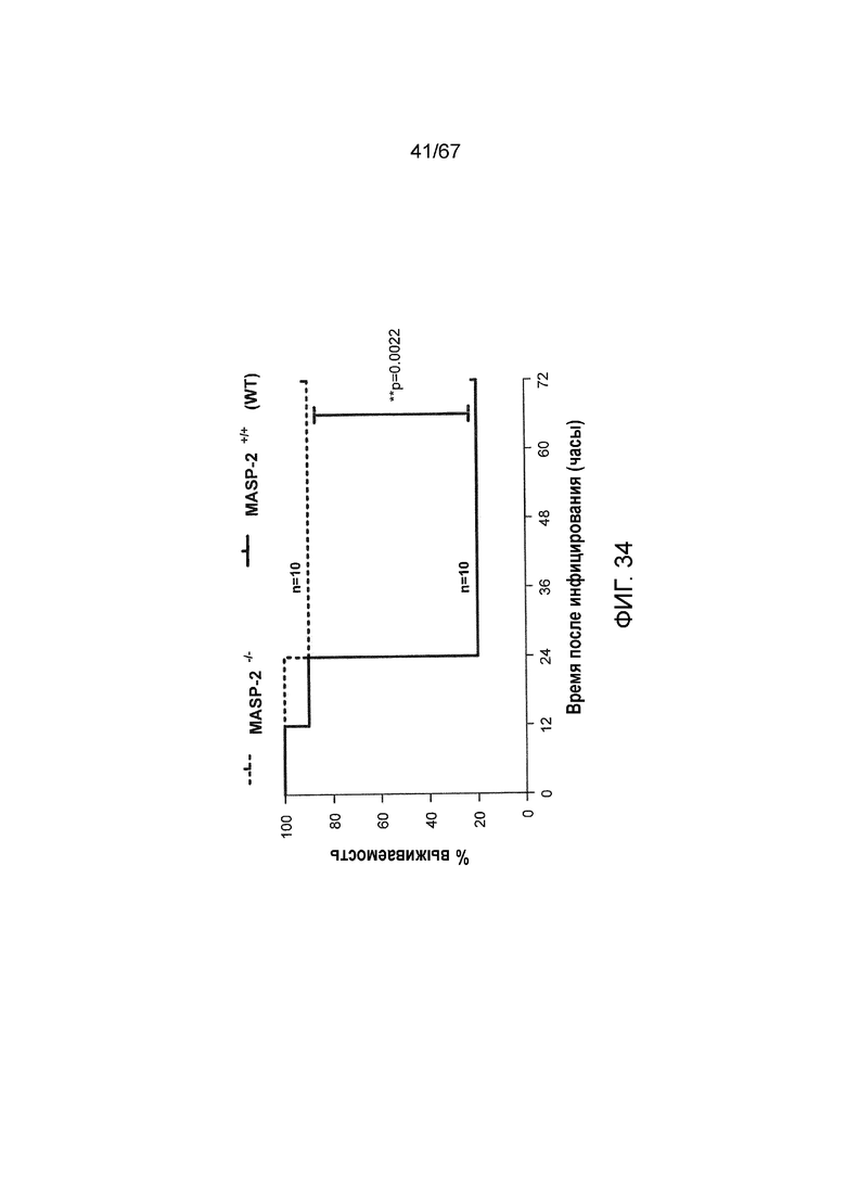На фиг.34 представлен график Каплана-Мейера, графически иллюстрирующий процентную выживаемость мышей MASP-2 KO и WT после инфекционной дозы 6×106 к.о.е. N. meningitidis серогруппы B штамма MC58, демонстрирующий, что мыши с дефицитом MASP-2 защищены от индуцируемой N. meningitidis серогруппы B штамма MC58 смертности, как описано в примере 30;