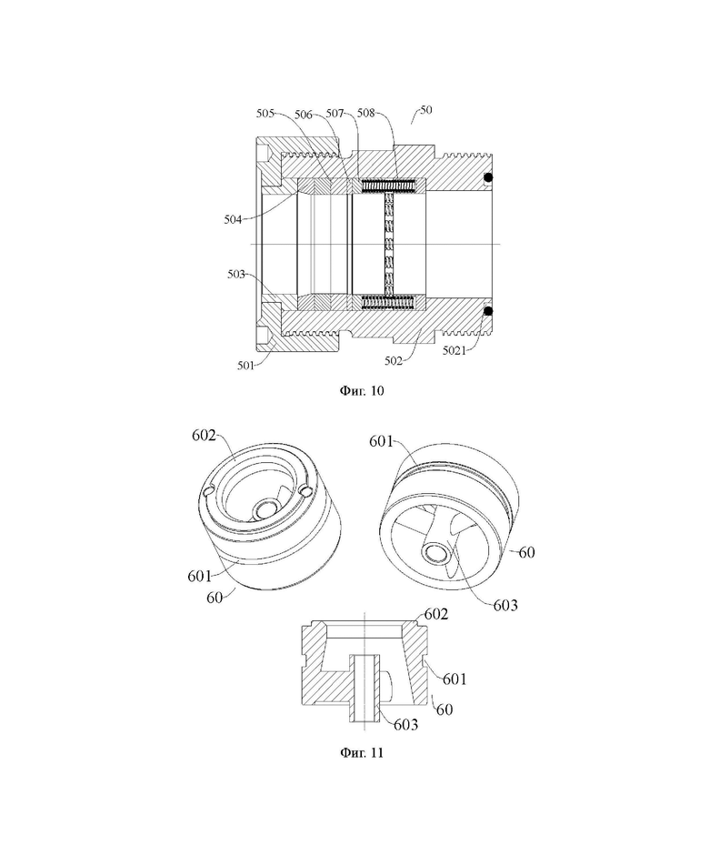 Как показано на фиг. 7 и 11, верхний конец седла 60 всасывающего клапана снабжен третьей кольцевой бобышкой 602, при этом третья кольцевая бобышка 602 проходит во внутреннюю полость распорной втулки 70 и упирается в нижний конец распорной втулки 70. Верхний конец седла 60 всасывающего клапана также снабжен первой конической фаской, при этом первая коническая фаска соединена с внутренней периферийной поверхностью и верхним торцом седла 60 всасывающего клапана по отдельности.