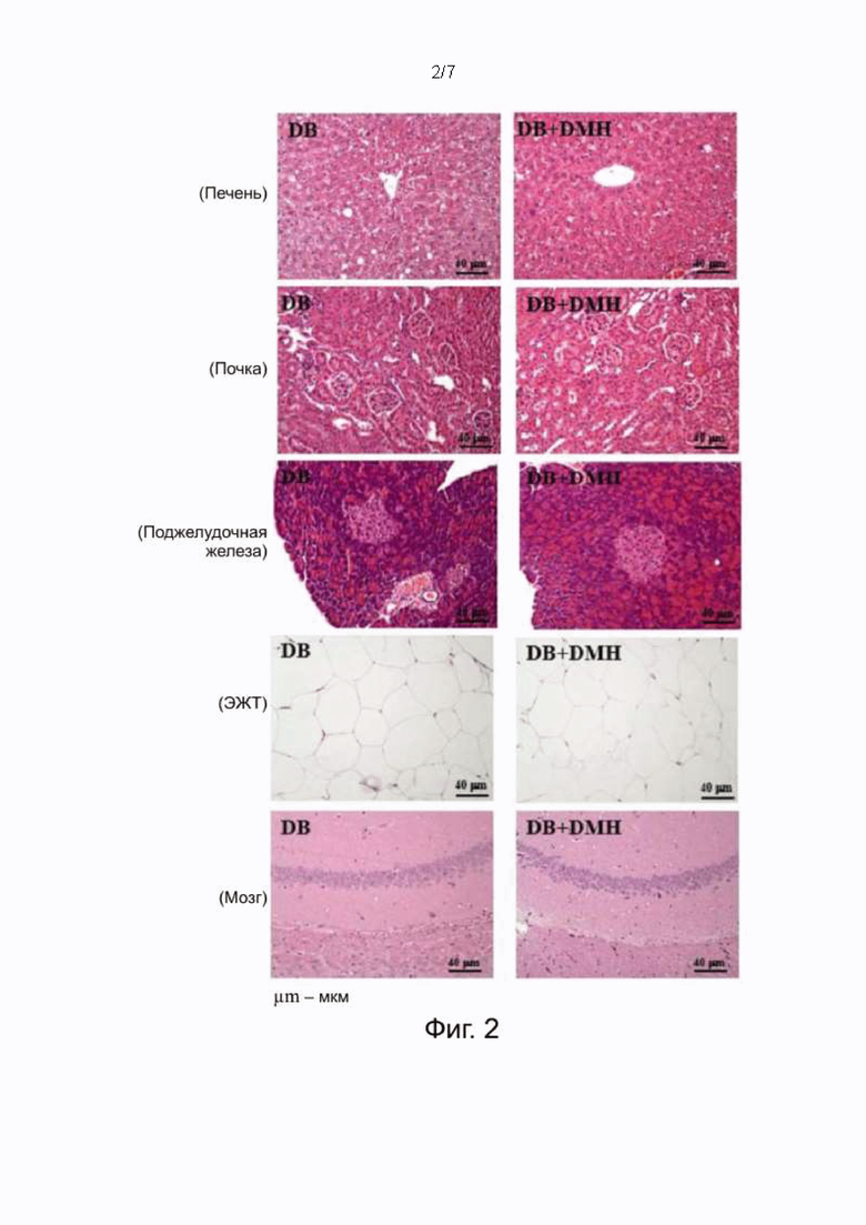 На Фиг. 2 показана гистология различных тканей после лечения эртапенемом. DB: db/db мыши, которым перорально вводили дистиллированную воду и внутрибрюшинно (в.б.) вводили физиологический раствор. DB+DMH: db/db мыши, получавшие эртапенем (0,41 мг/г м.т./сутки), в.б. Масштабная линейка: 40 мкм. ЭЖТ: эпидидимальная жировая ткань.