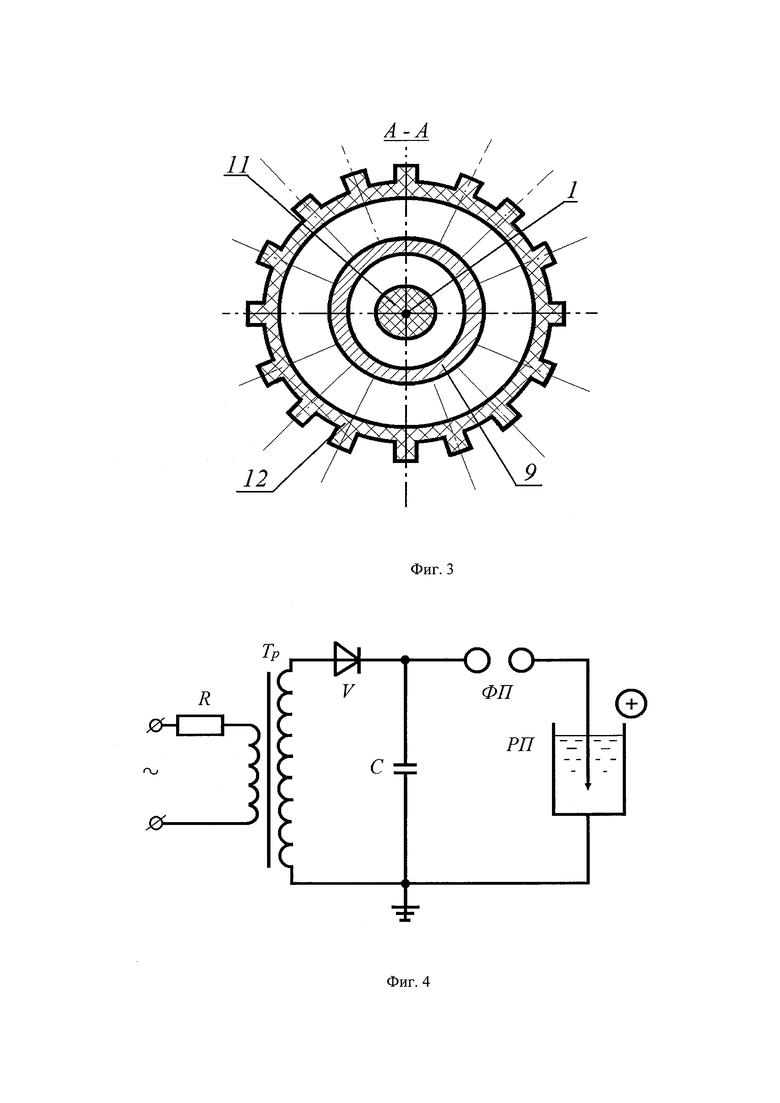 Согласно исследованиям Л.А. Юткина, электрогидравлический эффект возникает в ионопроводящей жидкости при воздействии на нее электроэнергией напряжением до 100 кВ, емкостью до 1 мкФ, установкой, электрическая схема которой приведена на фиг.4. При этом должно быть соблюдено условие:
