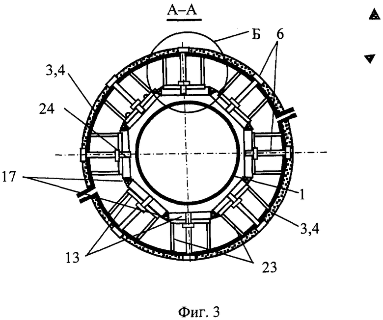 Предлагаемый ТЭВПАТГ содержит газовый патрубок 1, покрытый снаружи цилиндрическим воздушным кожухом 2, состоящим из двух полукожухов 3, покрытых слоем теплоизоляции 4 и снабженных крепежными отверстиями 5, в которые вставлены сквозные крепежные болты 6, соединенный с теплогенератором 7 и магистральной трубой дымовых газов 8, причем кожух 2 заглушен с внутреннего торца и образует с наружного торца кольцевую заборную щель 9, а также соединен воздуховодом 10, снабженным дутьевым вентилятором 11, с топкой теплогенератора 7, внутри него вокруг наружной поверхности газового патрубка 1 устроен термоэлектрический блок (ТЭБ) 12, соединенный электропроводкой с электродвигателем вентилятора 11, инвертором и аккумулятором (на фиг. 1-6 не показаны), сам ТЭБ 12 состоит, из расположенных на поверхности трубопровода N термоэлектрических секций (ТЭС) 13, каждая из которых представляет собой продольную рамку 14, установленную с зазором Δ от наружной поверхности газового патрубка 1 и состоящую из n клеток 15, на торцах которой устроены по одному крепежному резьбовому отверстию 16, в которые вкручены сквозные крепежные болты 6, между боковыми сторонами продольных рамок 14 каждой ТЭС-13 встроены продольные уплотнения 17, а на кромки клеток 15 уложены своими нижними кромками n плоских термоэлектрических преобразователей (ПТЭП) 18 (в качестве ПТЭП могут быть использованы, например, элементы Пелтье), соединенных токовыводами 19, 20 с коллекторами одноименных зарядов 21 и 22, причем на верхнюю наружную поверхность ПТЭП 18 каждой рамки 14 ТЭС 13 наложены П-образные радиаторы 23, выполненные из материала с высокой теплопроводностью, ширина основания которых равна ширине ПТЭП 18 и состоит из n клеток 24, границы длины которых проходят посредине каждого ПТЭП 17, а торцы снабжены проходными отверстиями 25 и прижаты к наружной поверхности ПТЭП прижимными гайками 26 на сквозных крепежных болтах 6.
