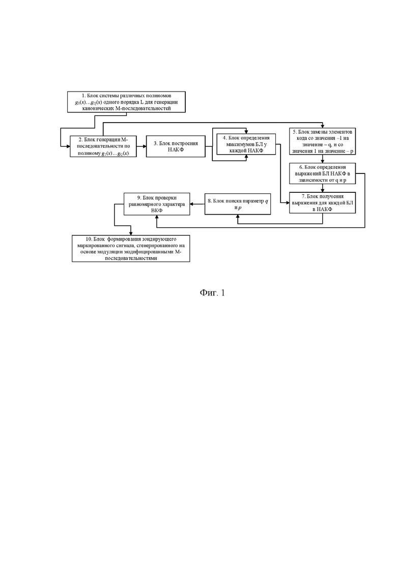 Изобретение относится к электронно-вычислительной технике. Техническим результатом является обеспечение более низкого уровня боковых лепестков апериодической автокорреляционной функции, чем у аналогичной АКФ канонических М-последовательностей, при этом ВКФ этих последовательностей носит равномерный характер, что обеспечивает выделение модулированных зондирующих сигналов в общем радиолокационном канале при реализации режимов многопозиционных бортовых систем. Технический результат достигается тем, что предлагаемый способ реализует поиск М-последовательностей за счет введения новых значений для каждой из кодовых структур, генерируемой в рамках группы полиномов одного порядка, что позволяет однозначно при приеме в общем радиолокационном канале идентифицировать модулированные этой новой последовательностью сигналы, при одновременном их излучении с N позиций многопозиционной системы бортовых РЛС, разнесенных в пространстве и объединенных во взаимодействующую группу. 1 ил.