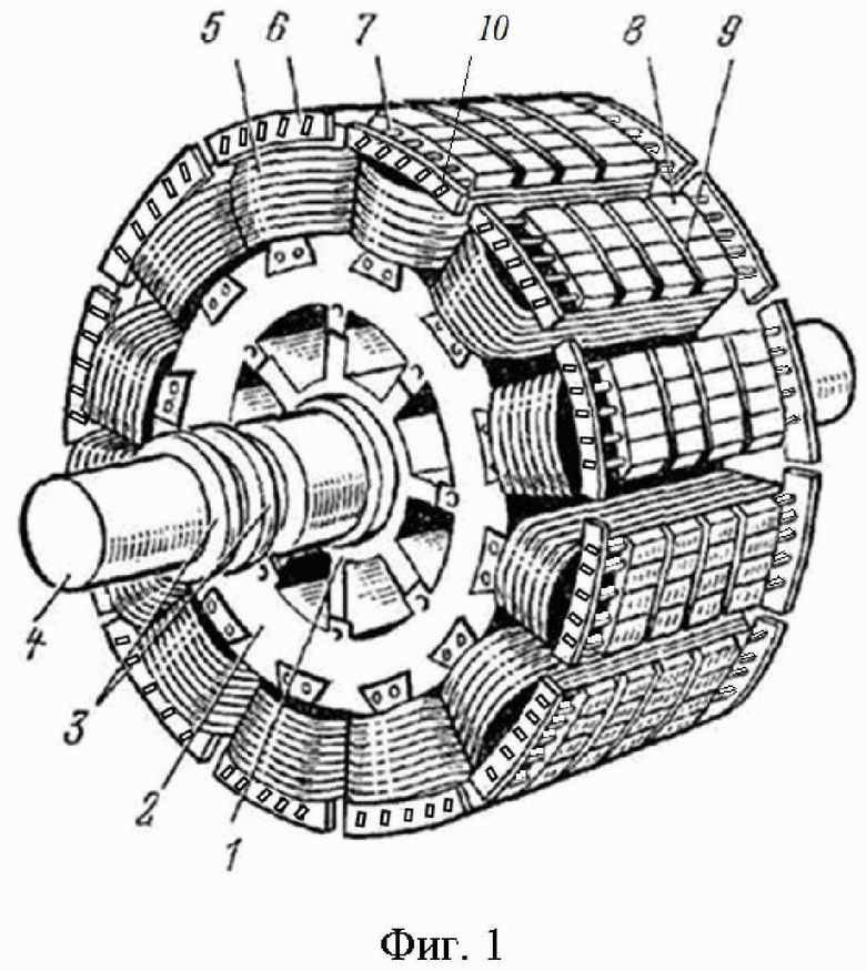 На фиг. 1 показан внешний вид явнополюсного ротора синхронного двигателя. На фиг. 2 представлена схема полюсного башмака со скошенным пазом для пусковой обмотки, где: а - поперечный размер паза; b - расстояние между пусковыми обмотками; α - угол скоса; Lb - удаленность от края полюсного башмака; х, у - расчетная система координат.