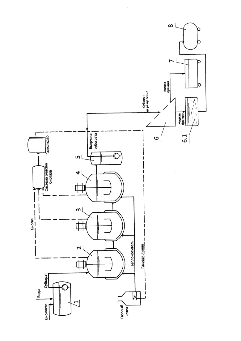 Предложенный способ осуществляется следующим образом. В смеситель 1 подается свежий навоз (не более 5 суток), где его разбавляют водой до 92%-94% влажности, механически перемешивают и нагревают до температуры, близкой к температуре мезофильного режима. Полученный субстрат подают в модульный биореактор 2 с мезофильным режимом с температурой 37°С - 38°С. Затем субстрат переходит в модульный биореактор 3 с мезофильным режимом с температурой 38°С - 39°С и далее - в модульный биореактор 4 с термофильным режимом с температурой 52°С - 55°С. В модульных биореакторах 2, 3 и 4 осуществляется анаэробное сбраживание с отведением биогаза. Давление в модульных биореакторах 2,3 и 4 - от 10 кПа до 0,1 МПа, а рН - в модульном биореакторе 2 составляет 6,0-6,2; в модульном биореакторе 3 составляет 6,2-6,4; в модульном биореакторе 4 составляет 7,0-7,2. В модульных биореакторах 2,3 и 4 осуществляется известное анаэробное сбраживание с применением типизированных и широко применяемых устройств. Модульные биореакторы представляют собой герметичные аппараты, оснащенные патрубками подведения и отведения субстрата и отведения биогаза, являются типизированными и широко применяемыми на практике.