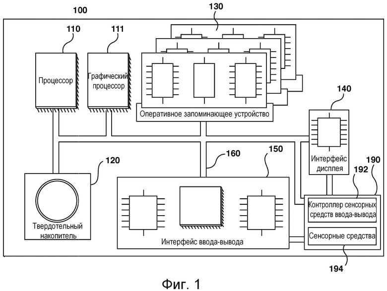 [059] Интерфейс 150 ввода-вывода может соединяться с сенсорным экраном 190 и/или с одной или несколькими внутренними и/или внешними шинами 160. Сенсорный экран 190 может входить в состав дисплея. В некоторых не имеющих ограничительного характера вариантах осуществления настоящей технологии сенсорный экран 190 сам представляет собой дисплей. Сенсорный экран 190 может также называться экраном 190. В представленных на фиг. 1 вариантах осуществления изобретения сенсорный экран 190 содержит сенсорные средства 194 (например, чувствительные к нажатию ячейки, встроенные в слой дисплея и позволяющие обнаруживать физическое взаимодействие между пользователем и дисплеем) и контроллер 192 сенсорных средств ввода-вывода, который обеспечивает связь с интерфейсом 140 дисплея и/или с одной или несколькими внутренними и/или внешними шинами 160. В некоторых вариантах осуществления изобретения интерфейс 150 ввода-вывода может соединяться с клавиатурой (не показана), мышью (не показана) или сенсорной площадкой (не показана), которые обеспечивают взаимодействие пользователя с компьютерной системой 100 в дополнение к сенсорному экрану 190 или вместо него.