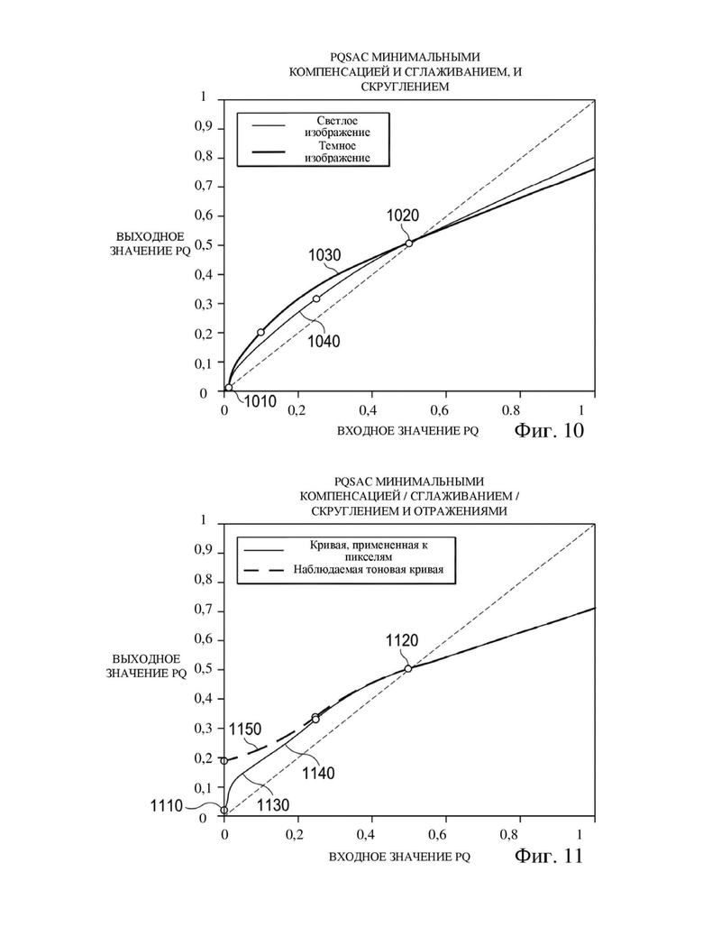 ЕЕЕ11. Способ, изложенный в любом из пронумерованных иллюстративных вариантов осуществления 1–10, который дополнительно включает вычитание значения компенсации отражения из данных PQ в линейном пространстве в конце вычисления тоновой кривой, что обеспечивает компенсацию ожидаемых отражений от экрана на дисплейном устройстве.