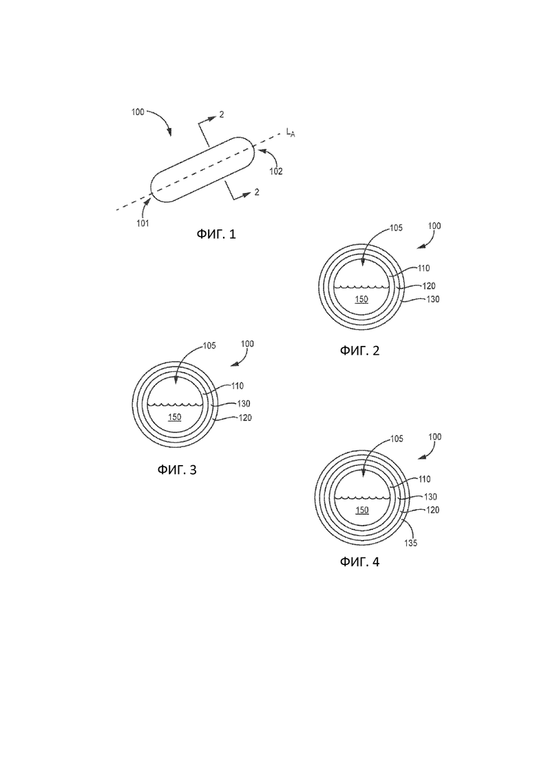 Фиг. 1 представляет собой схематическое изображение в перспективе иллюстративной высокобарьерной капсулы 100. На фиг. 2 - фиг. 4 представлены альтернативные конфигурации высокобарьерной капсулы 100. Высокобарьерная капсула 100 содержит полимерный корпус 110, проходящий вдоль продольной оси LA от первого конца 101 до второго конца 102, определяющий полость 105 капсулы, заключающую в себе порошок 150. Металлическая фольга 120 и слой 130 герметика покрывают внешнюю поверхность полимерного корпуса 110.