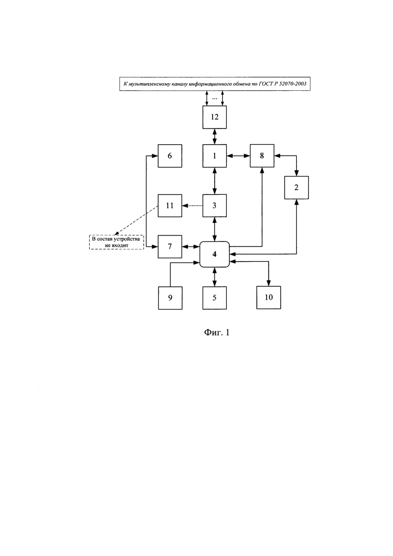На фиг. 1 показана схема устройства технического диагностирования КБО ВС на основе машинного обучения: 1 - микроконтроллер декодирования слов данных «Манчестер II»; 2 - постоянное запоминающее устройство 1 (ПЗУ 1) (память данных: хранение адресных обучающих информационных данных); 3 - коммутатор (связь микроконтроллера и нейропроцессора); 4 - нейропроцессор К1879ВМ8Я NeuroMatrix из линейки процессоров НТЦ «Модуль»; 5 - оперативное запоминающее устройство (ОЗУ); 6 - ПЗУ 2 (память команд: хранение обученных адресных моделей машинного обучения); 7, 8 - программаторы; 9 - модуль преобразования электропитания из 27 В постоянного тока в 5В, 3,3В, 2В постоянного тока; 10 - ПЗУ 3 (хранение программ автоматического определения оптимальных параметров обучения алгоритмов; программ автоматического определения оптимальных параметров фильтрации одномерного фильтра Калмана для каждого ИПЭ); 11 - штатная бортовая автоматизированная система контроля (БАСК) ВС (не входит в состав устройства технического диагностирования); 12 - шлейф подключения к МКИО (согласно ГОСТ Р 52070-2003).