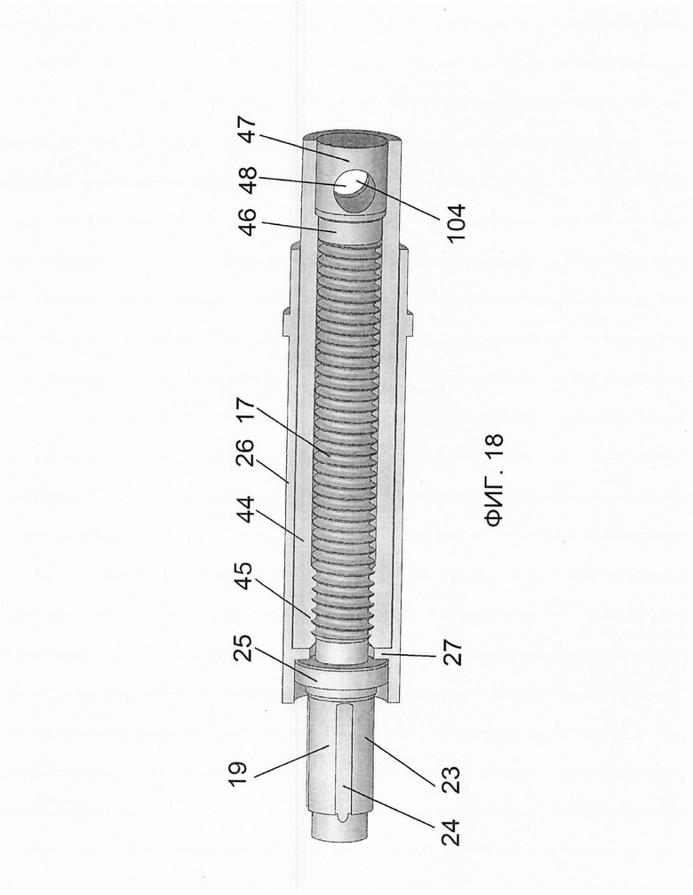 На фиг. 18 изображен винт механизма пошагового перемещения накостной пластины, охваченный корпусом в виде трубки с кольцевым выступом внутри, в кольцевом зазоре между корпусом в виде трубки и винтом на резьбу винта навинчена дополнительная трубка, к торцу винта жестко прикреплена (приварена) шайба, с наружным диаметром, равным диаметру винта с резьбой, причем к дополнительной трубке жестко прикреплена (приварена) цилиндрообразная заглушка с поперечным сквозным отверстием, аксонометрия;