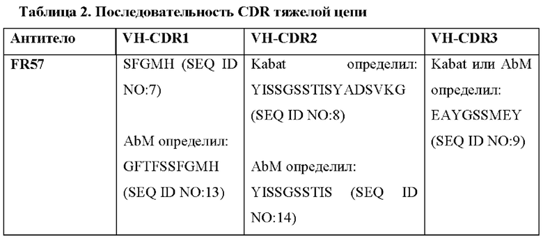 [0008] В некоторых вариантах осуществления первый FRα-связывающий домен специфически связывается с тем же эпитопом FRα, что и антитело, содержащее аминокислотную последовательность VH, выбранную из группы, состоящей из SEQ ID NO: 24, 25 и 26, и аминокислотную последовательность VL, выбранную из группы, состоящей из SEQ ID NO: 19, 20 и 21. В некоторых вариантах осуществления первый FRα-связывающий домен специфически связывается с тем же эпитопом FRα, что и антитело, содержащее аминокислотную последовательность VH, выбранную из группы, состоящей из SEQ ID NO: 24, 57 и 26, и аминокислотную последовательность VL, выбранную из группы, состоящей из SEQ ID NO: 19, 20 и 21. В некоторых вариантах осуществления первый FRα-связывающий домен конкурентно ингибирует связывание с тем же эпитопом FRα, что и антитело, содержащее аминокислотную последовательность VH, выбранную из группы, состоящей из SEQ ID NO: 24, 25 и 26, и аминокислотную последовательность VL, выбранную из группы, состоящей из SEQ ID NO: 19, 20 и 21. В некоторых вариантах осуществления первый FRα-связывающий домен конкурентно ингибирует связывание с тем же эпитопом FRα, что и антитело, содержащее аминокислотную последовательность VH, выбранную из группы, состоящей из SEQ ID NO: 24, 57 и 26, и аминокислотную последовательность VL, выбранную из группы, состоящей из SEQ ID NO: 19, 20 и 21. В некоторых вариантах осуществления второй FRα-связывающий домен специфически связывается с тем же эпитопом FRα, что и антитело, содержащее аминокислотную последовательность VH из SEQ ID NO: 22 или 23 и аминокислотную последовательность VL из SEQ ID NO: 17 или 18. В некоторых вариантах осуществления второй FRα-связывающий домен конкурентно ингибирует связывание с тем же эпитопом FRα, что и антитело, содержащее аминокислотную последовательность VH из SEQ ID NO: 22 или 23 и аминокислотную последовательность VL из SEQ ID NO: 17 или 18.