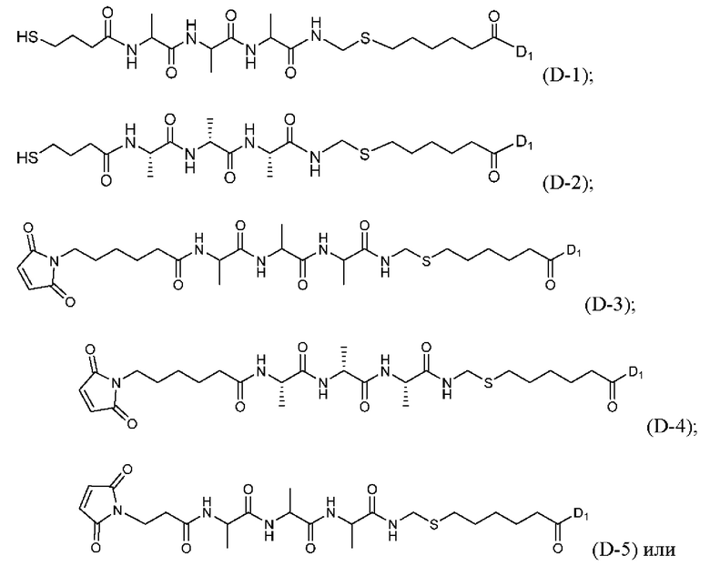 [0024] В некоторых вариантах осуществления А иммуноконъюгата выбран из группы, состоящей из Gly-Gly-Gly, Ala-Val, Val-Ala, D-Val-Ala, Val-Cit, D-Val-Cit, Val-Lys, Phe-Lys, Lys-Lys, Ala-Lys, Phe-Cit, Leu-Cit, Ile-Cit, Phe-Ala, Phe-N9-тозил-Arg, Phe-N9-нитро-Arg, Phe-Phe-Lys, D-Phe-Phe-Lys, Gly-Phe-Lys, Leu-Ala-Leu, Ile-Ala-Leu, Val-Ala-Val, Ala-Ala-Ala, D-Ala-Ala-Ala, Ala-D-Ala-Ala, Ala-Ala-D-Ala, Ala-Leu-Ala-Leu (SEQ ID NO: 54), β-Ala-Leu-Ala-Leu (SEQ ID NO: 55), Gly-Phe-Leu-Gly (SEQ ID NO: 56), Val-Arg, Arg-Arg, Val-D-Cit, Val-D-Lys, Val-D-Arg, D-Val-Cit, D-Val-Lys, D-Val-Arg, D-Val-D-Cit, D-Val-D-Lys, D-Val-D-Arg, D-Arg-D-Arg, Ala-Ala, Ala-D-Ala, D-Ala-Ala, D-Ala-D-Ala, Ala-Met, Gln-Val, Asn-Ala, Gln-Phe, Gln-Ala, D-Ala-Pro, и D-Ala-tBu-Gly, где первая аминокислота в каждом пептиде соединена с группой L2, а последняя аминокислота в каждом пептиде соединена с -NH-CR1R2-S-L1-D В некоторых вариантах осуществления R1 и R2 иммуноконъюгата оба представляют собой Н. В некоторых вариантах осуществления L1 иммуноконъюгата представляет собой -(СН2)4-6-С(=O)-.