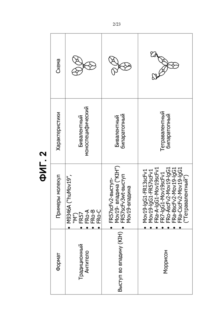 [0014] В некоторых вариантах осуществления бипаратопное антитело или его антигенсвязывающий фрагмент представляет собой четырехвалентное бипаратопное антитело или его антигенсвязывающий фрагмент. В некоторых вариантах осуществления бипаратопное антитело или его антигенсвязывающий фрагмент представляет собой двухвалентное бипаратопное антитело или его антигенсвязывающий фрагмент. В некоторых вариантах осуществления бипаратопное антитело или его антигенсвязывающий фрагмент содержит FRα-связывающие домены, выбранные из группы, состоящей из тандемных scFv, диатела, триатела, тетратела и структуры «выступ во впадину». В некоторых вариантах осуществления t бипаратопное антитело или его антигенсвязывающий фрагмент имеет структуру «выступ во впадину» (KIH).