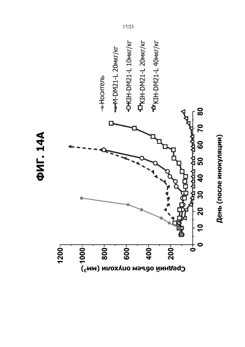 [0059] На ФИГ. 14А и 14В показаны средние объемы опухоли после введения бипаратопного иммуноконъюгата KIH-L-DM21 и иммуноконъюгата huMov19 M-L-DM21 (ФИГ. 14) или бипаратопного иммуноконъюгата KIH-S-SPDB-DM4 и иммуноконъюгата huMov19 M-s-SPDB-DM4 (ФИГ. 14В) к модели ксенотрансплантата ОВ-90. (См. Пример 6.)