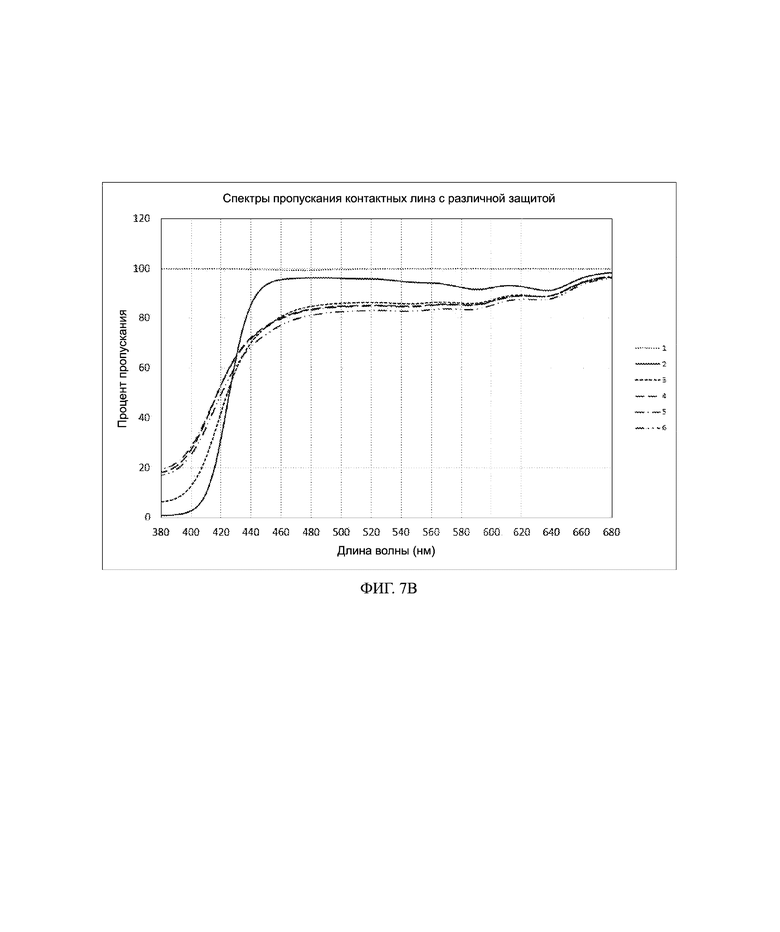 На Фиг. 7А кривая 1 представляет собой эталонный контроль. Кривая 2 представляет собой испытываемую не подвергающуюся воздействию линзу из примера 3. Кривая 3 представляет собой испытываемую линзу, подвергающуюся воздействию 2 мМ раствора верхнего слоя LAC1. Кривая 4 представляет собой испытываемую линзу, подвергающуюся воздействию 0,5 мМ раствора верхнего слоя LAC1. Кривая 5 представляет собой испытываемую линзу, подвергающуюся воздействию 0,1 мМ раствора верхнего слоя LAC1. Кроме того, кривая 6 представляет собой испытываемую линзу, подвергающуюся воздействию 0 мМ раствора верхнего слоя LAC1 (т. е. только растворителя на основе пропиленгликоля). На Фиг. 7B представлен увеличенный вид Фиг. 7A, показывающий пропускание при 380-680 нм.
