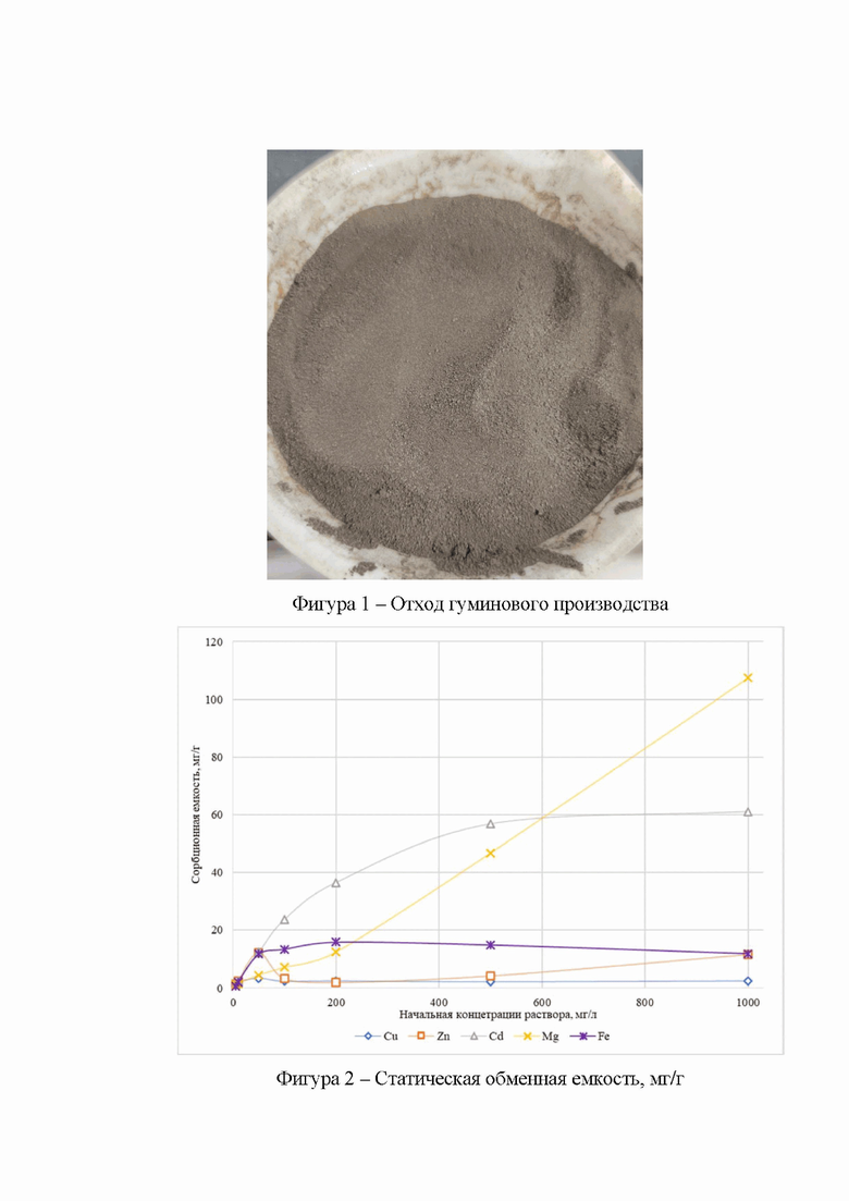 Целью предлагаемого изобретения является разработка сорбционного материала, в основе которого лежит отход гуминового производства (ОГП), обладающий способностью к нейтрализации ионов тяжелых металлов (Cu2+, Zn2+, Fe3+, Cd2+, Mg2+) из сточных промышленных вод.