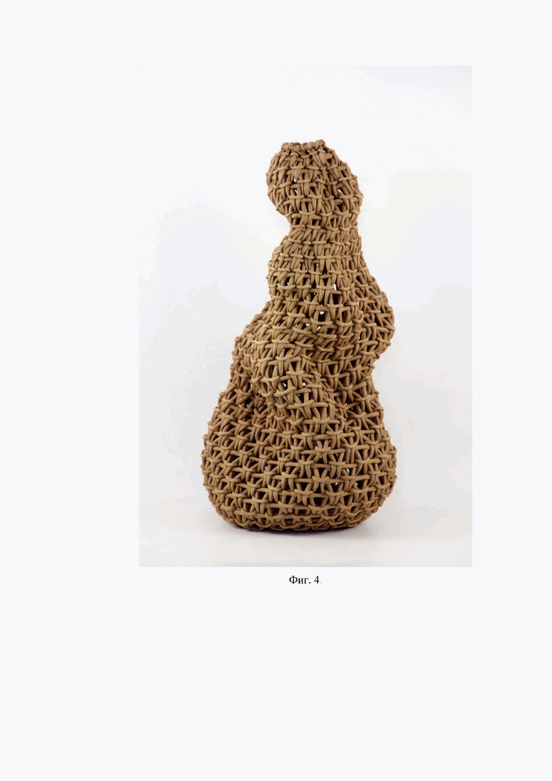Таким образом, в отличие от указанного прототипа, в заявленном способе обеспечивается возможность создания крупных изделий благодаря тому, что в процессе плетения, по мере набора высоты производится усиление рёбрами жесткости за счет приклеивания дополнительных элементов изнутри. Так же по мере «роста» скульптуры, ранее сплетенные ряды по мере высыхания приобретают жесткость и прочность необходимую для поддержания веса увеличивающейся скульптуры. При этом форма задается произвольно, за счет пластичности массы и свободы выбора направления плетения, что обеспечивает возможность плести из пластичной керамической массы любую форму: вогнутую, выпуклую, замкнутый объем.