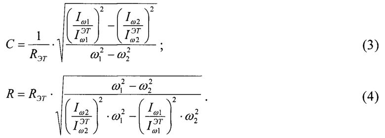 Для этого производят формирование синусоидального напряжения на сухом емкостном датчике уровня на двух частотах ω1 и ω2. Затем последовательно производят измерение значений токов через сухой емкостный датчик уровня и эталон на каждой из заданных частот. Значения токов через эталон соответствуют выражениям