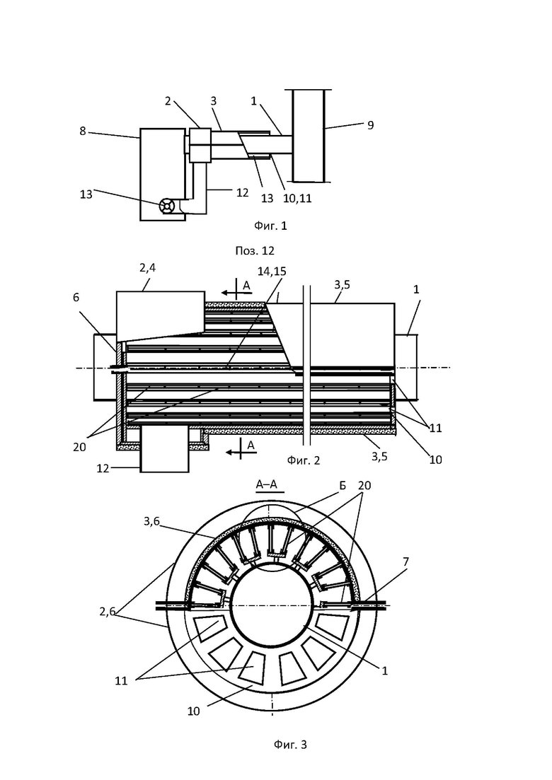 Предлагаемый ПФВПАТГ содержит газовый патрубок 1, покрытый снаружи, соединенными друг с другом, кольцевым коллектором 2 и цилиндрическим воздушным кожухом 3, каждый из которых состоит из двух полукольцевых коллекторов 4 и двух полуцилиндров 5, покрытых слоем теплоизоляции 6, соединенных друг с другом продольными фланцами 7 с крепежными отверстиями, в которые вставлены сквозные крепежные болты (на фиг. 1-5 не показаны), при этом газовый патрубок 1 соединен с теплогенератором 8 и магистральной трубой дымовых газов 9, кольцевой коллектор 2 и кожух 3 заглушены с внутреннего торца, кожух 3 с наружного торца закрыт кольцевой перегородкой 10 с заборными щелями 11, кольцевой коллектор 2 соединен воздуховодом 12, снабженным дутьевым вентилятором 13, с топкой теплогенератора 8, внутри кожуха 3 и коллектора 2 вокруг наружной поверхности газового патрубка 1 устроен термоэлектрический блок (ТЭБ) 14, соединенный электропроводкой с электродвигателем вентилятора 13, инвертором и аккумулятором (на фиг. 1-5 не показаны), сам ТЭБ 14 состоит, из расположенных над поверхностью патрубка 1 N термоэлектрических секций (ТЭС) 15, каждая из которых представляет собой продольную планку 16, снабженную снизу опорными пятками 17, установленную с зазором Δ от наружной поверхности газового патрубка 1, покрытую слоем тепловой изоляции 18 и снабженную сверху по бокам скобами 19, в которые вертикально вставлены n плоских термоэлектрических преобразователей (ПТЭП) 20 (в качестве ПТЭП 20 могут быть использованы, например, элементы Пельтье), соединенных токовыводами 21, 22 с коллекторами одноименных зарядов 23 и 24, причем верхние торцы ПТЭП 20 в цилиндрическом кожухе 3 вставлены в верхние скобы 25, соединенные с внутренней поверхностью полуцилиндров 5, образуя воздушные 26 и нагревательные 27 каналы.