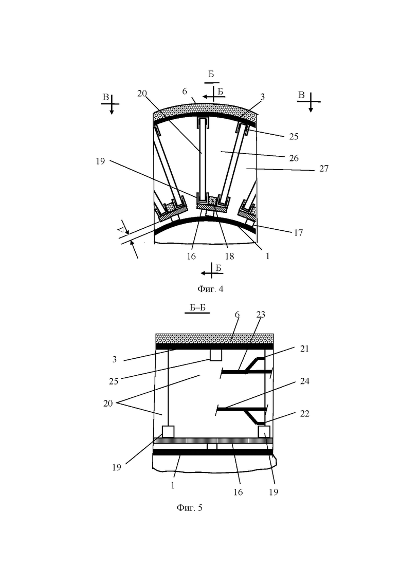 Величина разности электрического потенциала и силы тока на токовыводах 21, 22 и коллекторах 23, 24 зависит от разности температур нагреваемой и охлаждаемой стенок ПТЭП 20, их характеристик, количества и характеристик элементов ПТЭП 20 в ТЭС 15, их числа в ТЭБ 14 и величины зазора Δ, которую определяется размерами опорных пяток 17. При этом вертикальная компоновка ПТЭП 20 позволяет значительно увеличить их количество, не увеличивая размеры самой установки, что позволяет значительно увеличить ее эффективность. При необходимости устанавливают несколько ТЭБ 14. Требуемые напряжение U и силу тока I в зависимости от нагрузки теплогенератора 8 и величины разности температур (tП- tС) регулируют в инверторе (на фиг. 1-5 не показан). Полученное электричество используется для работы вентилятора 13 и, например, для автоматизации работы теплогенератора 8.