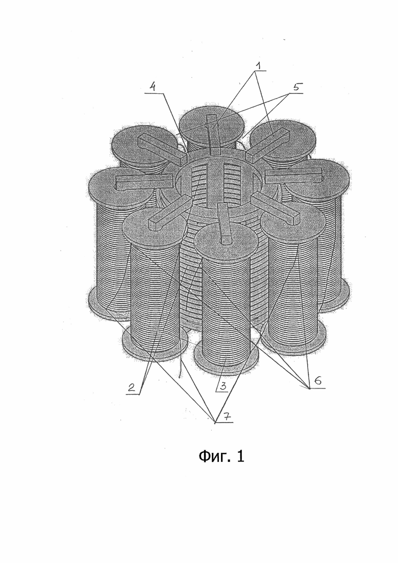 Известен трансформатор, содержащий первичные обмотки с высокой электропроводимостью, ярма, выполненные из ферромагнитного материала, и вторичные обмотки-сердечники, выполненные из ферромагнитного материала с высокой электропроводимостью, при этом первичные обмотки коаксиально охватывают вторичные обмотки-сердечники, которые, чередуясь с ярмами, соединены в замкнутую магнитную цепь, первичная обмотка также выполнена из ферромагнитного материала (Патент №2444803, опубл. 10.03.2012).