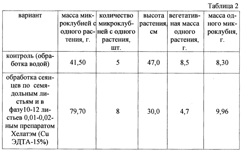 Таким образом, способ выращивания гибридных сеянцев картофеля, включающий проведение по вегетации прикорневую обработку водным раствором 2-хлорэтилфосфоновой кислоты с концентрацией 0,01…0,02% в фазу семядольных листьев и этим же раствором в фазу 10…12 пар листьев при норме расхода препарата 0,00004 кг/м2, позволяет повысить массу и количество клубней гибридных сеянцев картофеля при использовании малотоксичных препаратов.