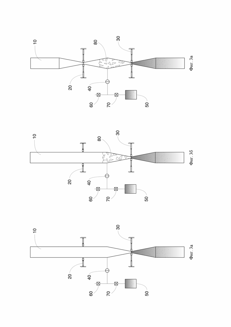 При установленном положении верхних и нижних прижимных элементов 20 и 30 осуществляют загрузку сырья 80 в шлюзовую камеру через гибкий трубопровод 10 (Фиг. 3б). Загружаемое сырье 80 представлено резиновыми «чипсами».
