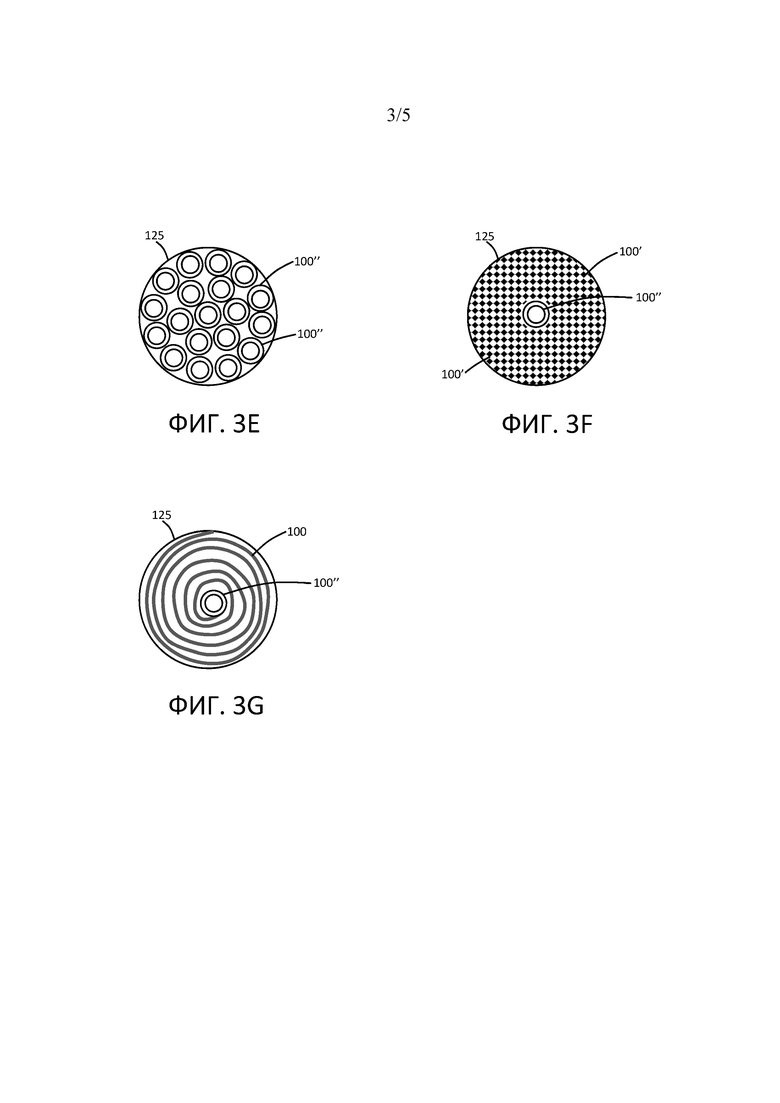 В качестве еще одного примера на ФИГ. 3D показано множество вкусоароматических подложек 100', которые выполнены в виде стержней, имеющих по существу квадратное поперечное сечение (хотя предусмотрено любое профилированное поперечное сечение) и окруженных необязательной наружной пленкой 125. Множество стержней показано в виде сетки, но может быть использован любой способ упаковки. В качестве еще одного примера на ФИГ. 3Е показано множество вкусоароматических подложек 100'', которые выполнены в виде трубок, имеющих по существу круглое поперечное сечение (хотя предусмотрено любое профилированное поперечное сечение) и окруженных необязательной наружной пленкой 125. Множество трубок могут быть оснащены любым требуемым способом упаковки. В качестве еще одного примера на ФИГ. 3F показано применение двух различных типов вкусоароматических подложек. Множество вкусоароматических подложек 100' в виде стержней включены вместе с одной вкусоароматической подложкой 100'' в виде трубки, все из которых окружены необязательной наружной пленкой 125. Опять же, стержни и трубки могут иметь любое требуемое поперечное сечение и могут быть обеспечены в любом требуемом количестве. В частности, хотя показана только одна трубка 100'' вкусоароматической подложки, следует понимать, что множество стержней 100' вкусоароматической подложки могут быть объединены с множеством трубок 100'' вкусоароматической подложки. В качестве дополнительного примера, на ФИГ. 3G также показано применение двух различных типов вкусоароматических подложек. Вкусоароматическая подложка 100 в виде листа включена с одной вкусоароматической подложкой 100'' в виде трубки, все из которых окружены необязательной наружной пленкой 125. Опять же, лист и трубка могут иметь любое требуемое поперечное сечение и могут быть обеспечены в любом требуемом количестве (например, один лист с множеством трубок, одна трубка с множеством листов или множество листов с множеством трубок). Аналогично, любое количество стержня(ей) 100' и/или трубки(ок) 100'' вкусоароматической подложки может быть объединено с любым количеством листов 100 вкусоароматической подложки, которые могут быть выполнены со складками, собраны или обернуты.