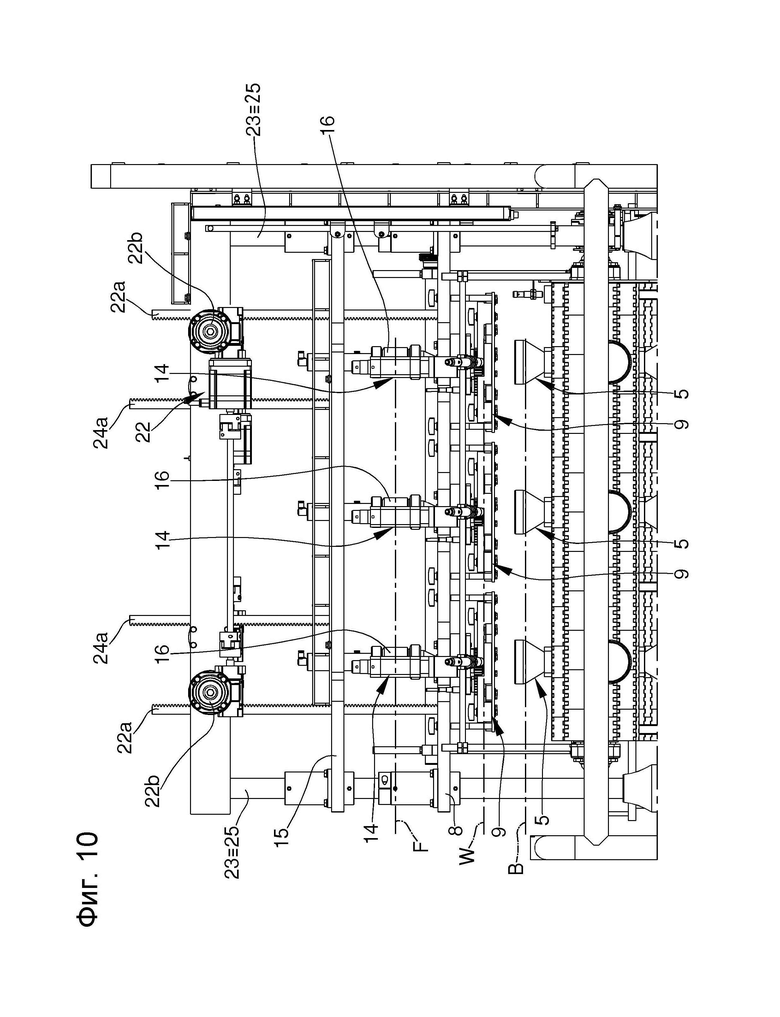 Приводной блок 22 содержит элемент 22a с зубчатой рейкой и шестерней, связанный с захватной рамой 8, по существу параллельно направляющему блоку 23, и исполнительное устройство 22b типа электродвигателя, соединенное непосредственно с элементом с зубчатой рейкой и шестерней и выполненное с возможностью перемещения захватной рамы 8 на направляющем блоке 23.