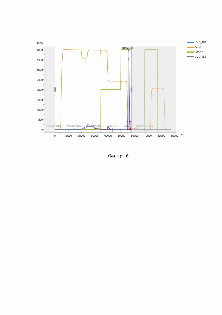 В результате реализации указанной стадии очистки было получено две ключевые фракции: проскок нанесения; целевой пик. Типичная хроматограмма данной стадии очистки представлена на фигуре 6.