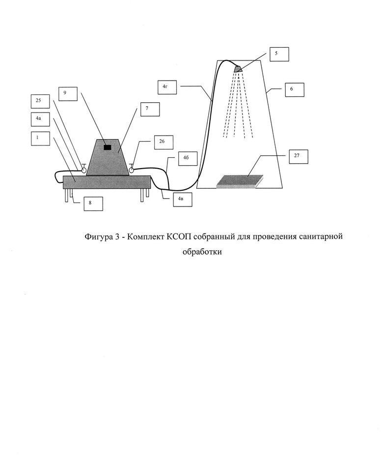 Изобретение поясняется рисунками, где на фиг. 1 показан комплект санитарной обработки переносной в сборе, на фиг. 2 укладочный ящик с элементами конструкции и на фиг. 3 комплект КСОП в собранном виде, где