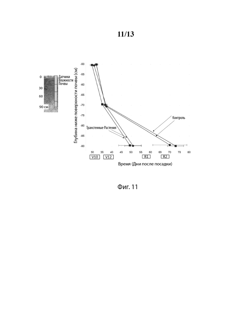 [38] На Фиг. 11 проиллюстрирован график, сравнивающий скорость роста корня во время стадий развития V10 и до R2 между трансгенными и контрольными растениями как в условиях SAP, так и в условиях HD с применением датчиков на разных глубинах почвы, которые обнаруживают изменения в уровнях воды, указывающие на наличие корней на этой глубине;