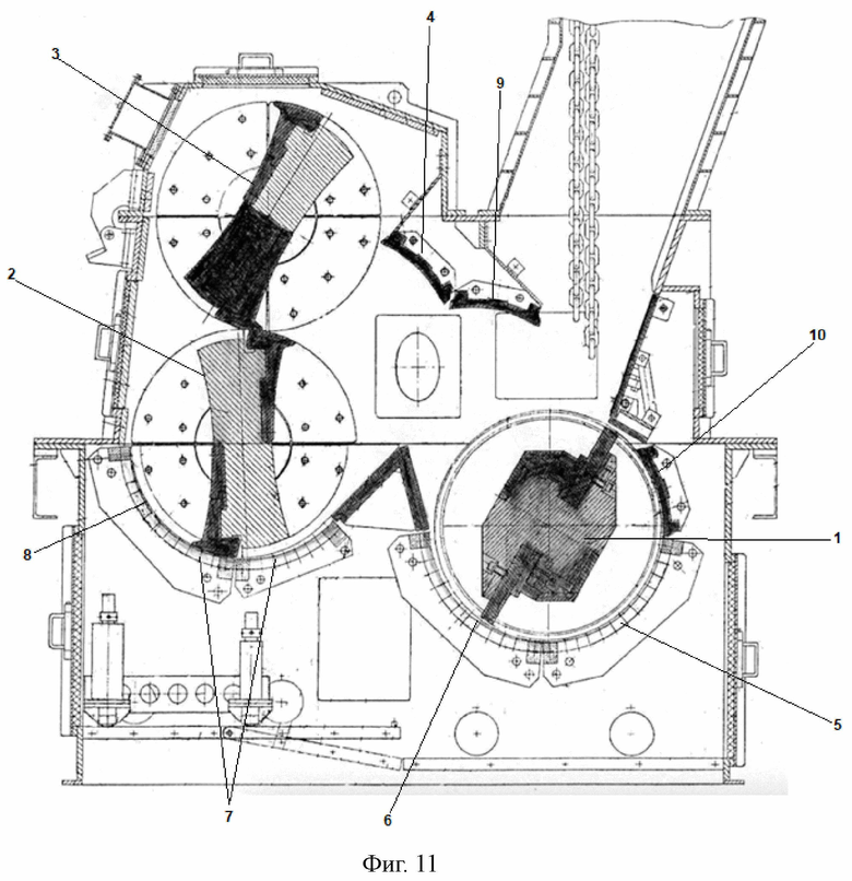 Использование подроторного отражательного элемента 10 и отражателя 9, установленного над ротором (фиг. 11) обеспечивает более точное соблюдение требуемого направления полета кусков горной массы. Это дает возможность в полной мере реализовать описанный способ дробления для материала разного размера, в том числе для больших по размеру кусков.