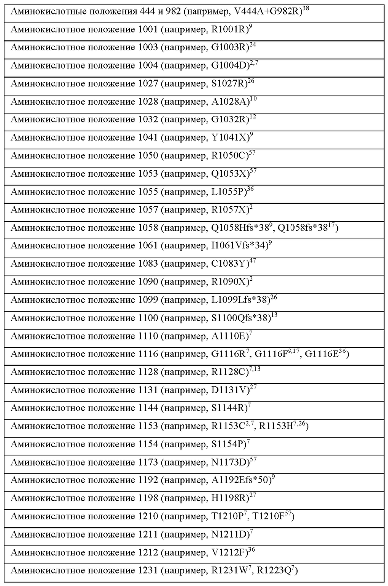Типичные мутации гена АТР8 В1 или полученного белка перечислены в Таблицах 2 и 3 с нумерацией на основе человеческого белка АТР8 В1 дикого типа (например, SEQ ID NO: 1) или гена (например, SEQ ID NO: 2). Типичные мутации гена АВСВ11 или полученного белка перечислены в Таблицах 4 и 5 с нумерацией на основе человеческого белка АВСВ11 дикого типа (например, SEQ ID NO: 3) или гена (например, SEQ ID NO: 4).