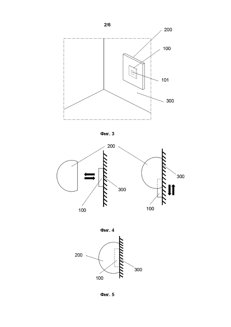[39] На фиг. 2, в качестве примера, но не ограничения, изображен один примерный вариант устройства 200, соединенного с кронштейном 100. Предпочтительно, не ограничиваясь, такое устройство 200 является преимущественно любой пригодной формы или размера, выбор которых обусловлен главным образом обеспечиваемой силой и надежностью магнитного соединения, а также силой и надежностью соединения кронштейна 100 с поверхностью 300. При этом, не ограничиваясь, в таком варианте исполнения устройство 200 не является преимущественно плоским, то есть, по меньшей мере, толщина выступающей части которого над образуемым кронштейном 100 выступом от поверхности 300, по меньшей мере, в два раза превышает толщину такого образованного выступа. При этом, не ограничиваясь, форма такого устройства 200 главным образом обуславливается его назначением.