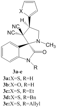 Известны спиропирролидины (3a-e), содержащие цианогруппы в качестве заместителей в пирролидиновом кольце и различные гетероароматические заместители в 4 положении пирролидинового цикла (2). Формулы: