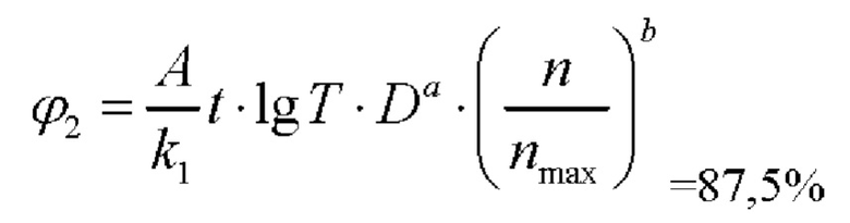 Где время пиролиза t=0,35 ч. Температура пиролиза Т=612°С. Средний размер частиц органических твердых отходов с высоким содержанием летучих веществ и органических твердых отходов с низким содержанием летучих веществ, поступающих в процесс пиролиза, составляет D=5 мм. Количество кислорода, транспортируемого в процессе пиролиза n2=1,95 м3 (на килограмм остатка смолы). Потребность в кислороде органических твердых отходов с высоким содержанием летучих веществ, поступающих в процесс пиролиза и полное сжигание органических твердых отходов с низким содержанием летучих веществ nmax=3,38 м3 (на килограмм остатка смолы). Коэффициент эффективности сжигания k1 органических твердых отходов с высоким содержанием летучих веществ составляет 0,85. Масса органических твердых отходов с высоким содержанием летучих веществ, поступающих в процесс пиролиза, m=500 кг/ч. Средняя теплотворная способность органических твердых отходов с высоким содержанием летучих веществ и органических твердых отходов с низким содержанием летучих веществ q=21453 Дж/кг. Значение коэффициента коррекции а на размер частиц составляет -0,08. Значение коэффициента коррекции b на содержание кислорода составляет 0,5. Коэффициент коррекции А составляет 1,10. то