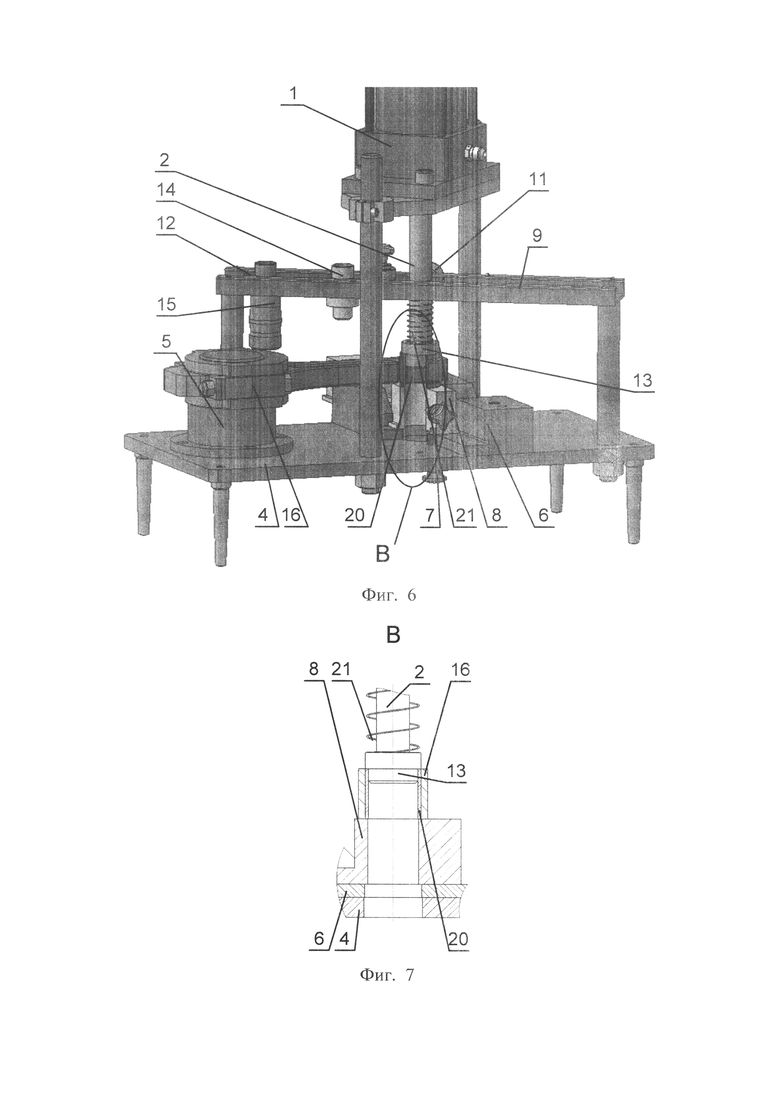 Для запрессовки втулки верхней головки шатуна подвижный корпус 8 устанавливается в неподвижном корпусе 6 и закрепляется фиксатором 7 в положении, когда отверстие для запрессовки втулки верхней головки шатуна находится напротив штока с оправкой 2 (фиг. 6). Обойма 12 устанавливается в направляющих 9 и закрепляется фиксатором 11 в положении, когда вставка 13 для запрессовки-выпрессовки втулки верхней головки шатуна находится напротив штока с оправкой 2. На вставку 13 устанавливается втулка верхней головки шатуна 20. Шатун 16 нижней головкой устанавливается на опору 5, а верхней головкой - на подвижный корпус 8, при этом отверстие под втулку верхней головки шатуна 20 располагается напротив штока с оправкой 2. При включении силового органа пресса 1 шток с оправкой 2 начинает двигаться вниз, заходя оправкой в отверстие вставки 13, и начинает перемещать ее вниз, растягивая пружину растяжения 21 вставки, при этом вставка 13 при дальнейшем движении запрессовывает втулку 20 в отверстие верхней головки шатуна (фиг. 7). После запрессовки втулки шток с оправкой 2 возвращается в исходное положение, а возвратная пружина 21 возвращает на место вставку 13.