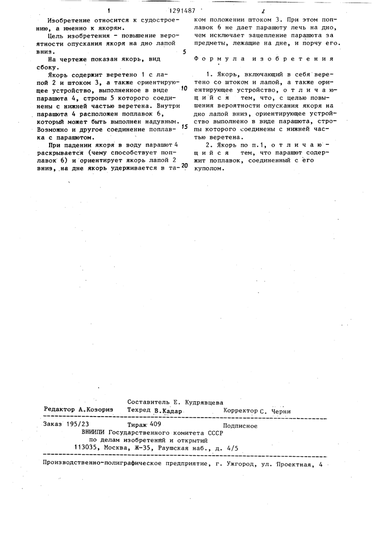Якорь содержит веретено 1 с лапой 2 и штоком 3, а также ориентирующее устройство, выполненное в виде парашюта 4, стропы 5 которого соединены с нижней частью веретена. Внутри парашюта А расположен поплавок 6, который может быть выполнен надувным. Возможно и другое соединение поплавка с парашютом.