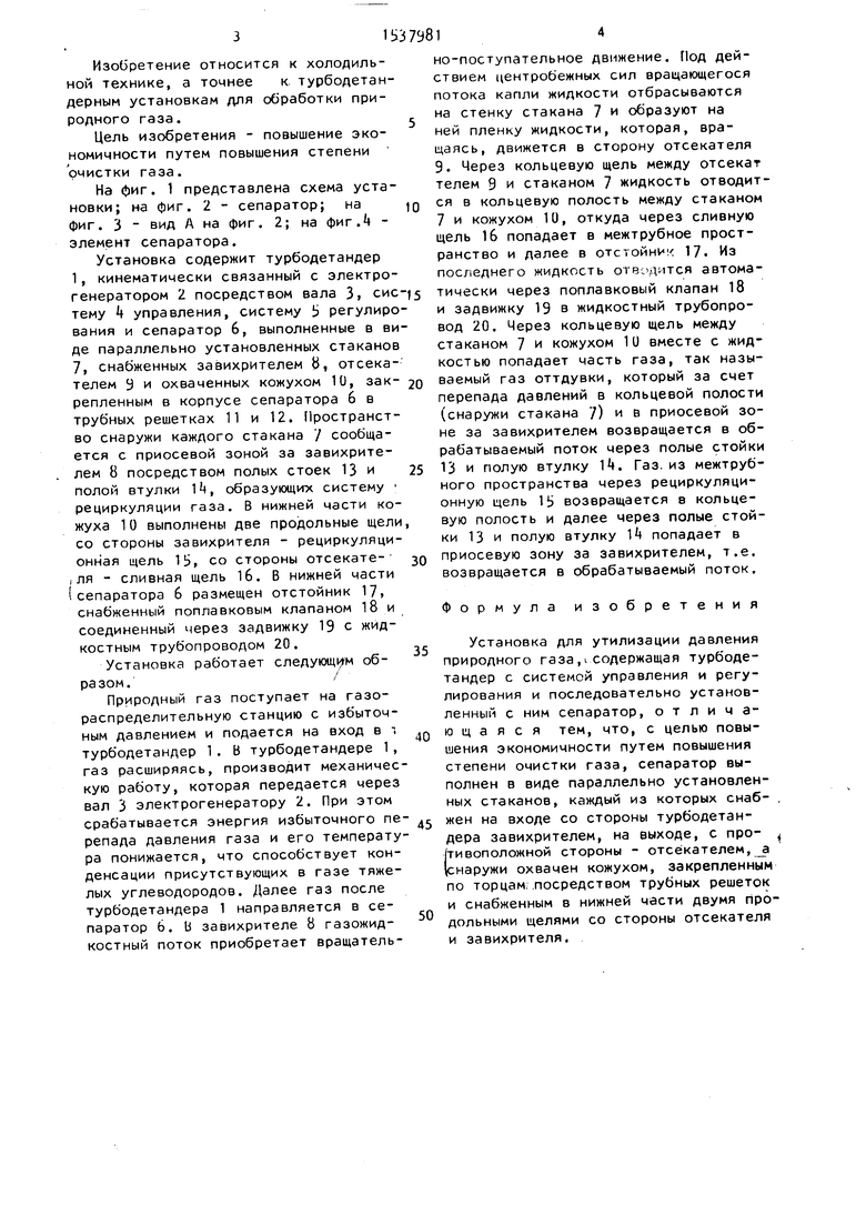 Установка содержит турбодетандер 1, кинематически связанный с электрогенератором 2 посредством вала 3t сис тему Ц управления, систему $ регулирования и сепаратор 6, выполненные в виде параллельно установленных стаканов 7, снабженных завихрителем В, отсека- телем У и охваченных кожухом 10, зак- репленным в корпусе сепаратора 6 в трубных решетках 11 и 12. Пространство снаружи каждого стакана 7 сообщается с приосевой зоной за завихрителем 8 посредством полых стоек 13 и полой втулки , образующих систему рециркуляции газа. В нижней части кожуха 10 выполнены две продольные щели со стороны завихрителя - рециркуляционная щель 15, со стороны отсекате- iля - сливная щель 16. В нижней части (сепаратора 6 размещен отстойник 17, снабженный поплавковым клапаном 18 и соединенный через задвижку 19 с жидкостным трубопроводом 20.
