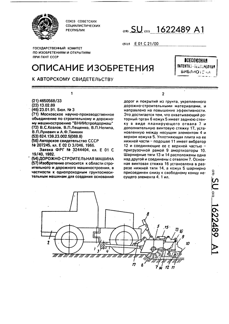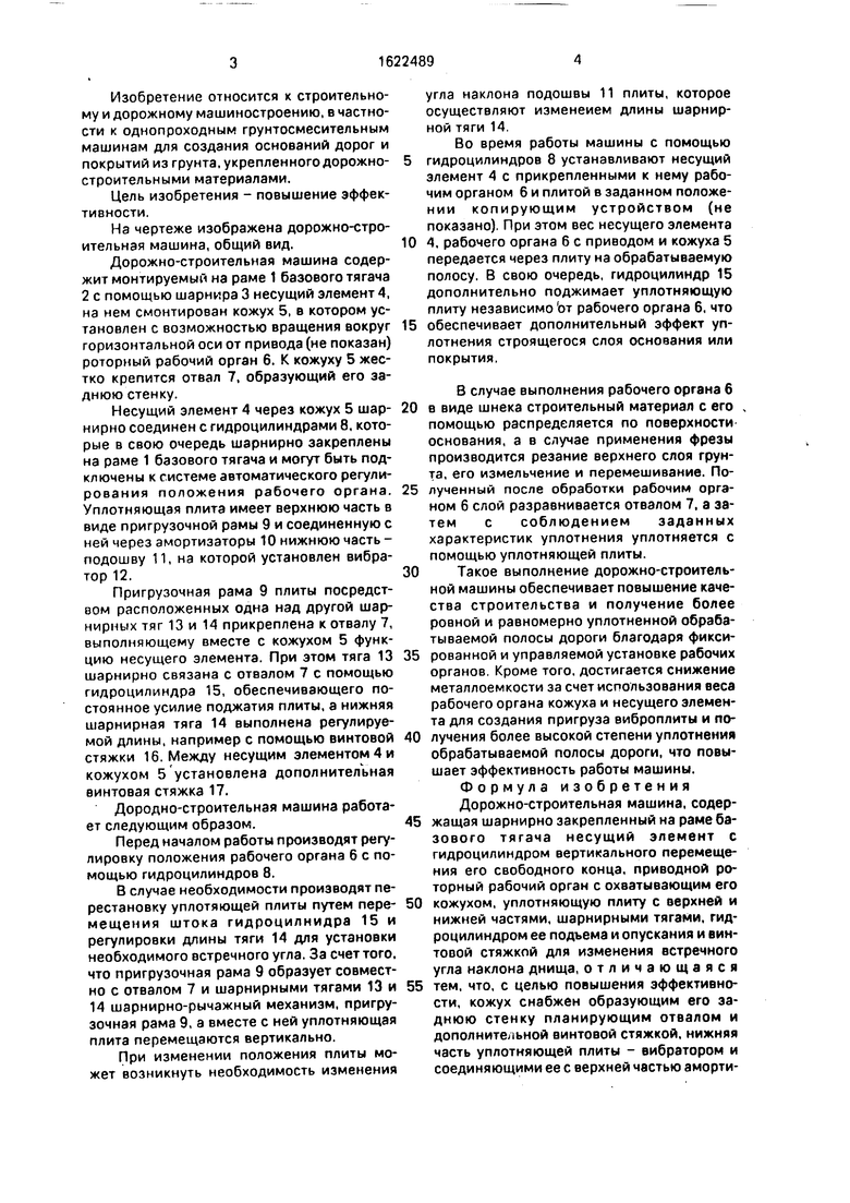 Изобретение относится к области строительного и дорожного машиностроения, в частности к однопроходным грунтосмеси- тельным машинам для создания оснований дорог и покрытий из грунта, укрепленного дорожностроительными материалами, и направлено на повышение эффективности. Это достигается тем, что охватывающий роторный орган 6 кожух 5 имеет заднюю стенку в виде планирующего отвала 7 и дополнительную винтовую стяжку 17, установленную между несущим элементом 4 и верхом кожуха 5. Уплотняющая плита на ее нижней части - подошве 11 имеет вибратор 12 и соединяющие ее с верхней частью - пригрузочной рамой 9 амортизаторы 10. Шарнирные тяги 13 и 14 расположены одна над другой и соединены с отвалом 7. Основная винтовая стяжка 16 установлена в разрезе нижней тяги 14, а кожух 5 шарнирно присоединен снизу к свободному концу несущего элемента 4. 1 ил. СЛ