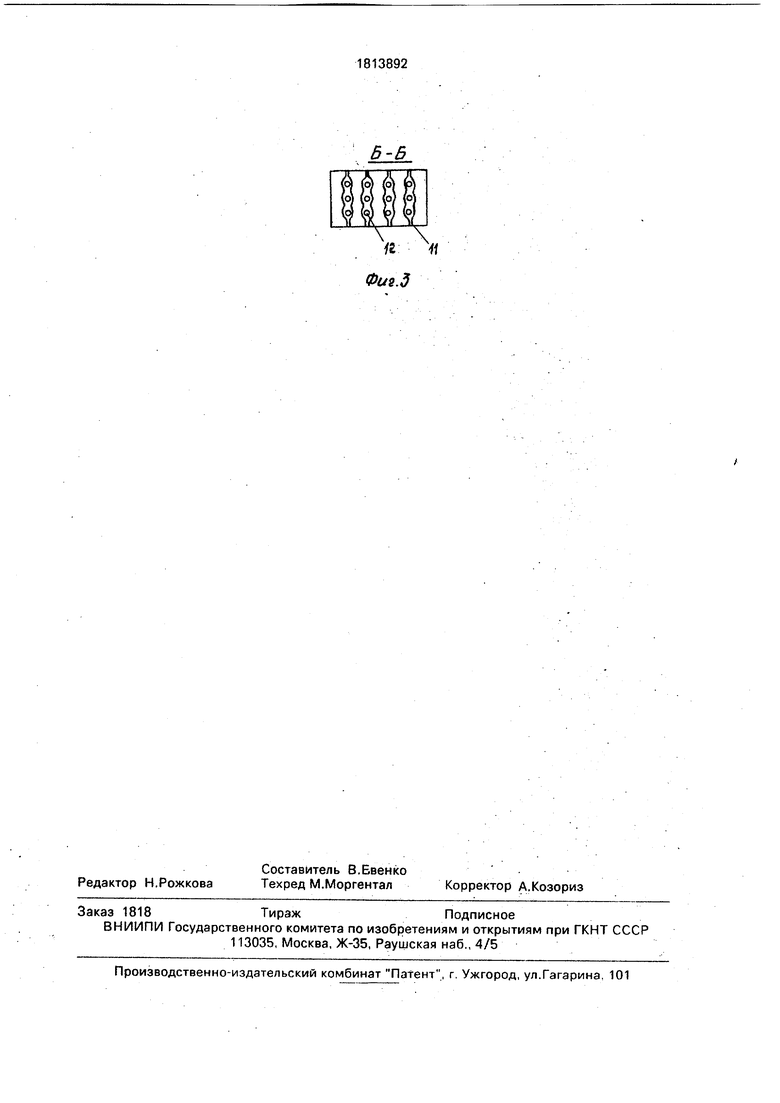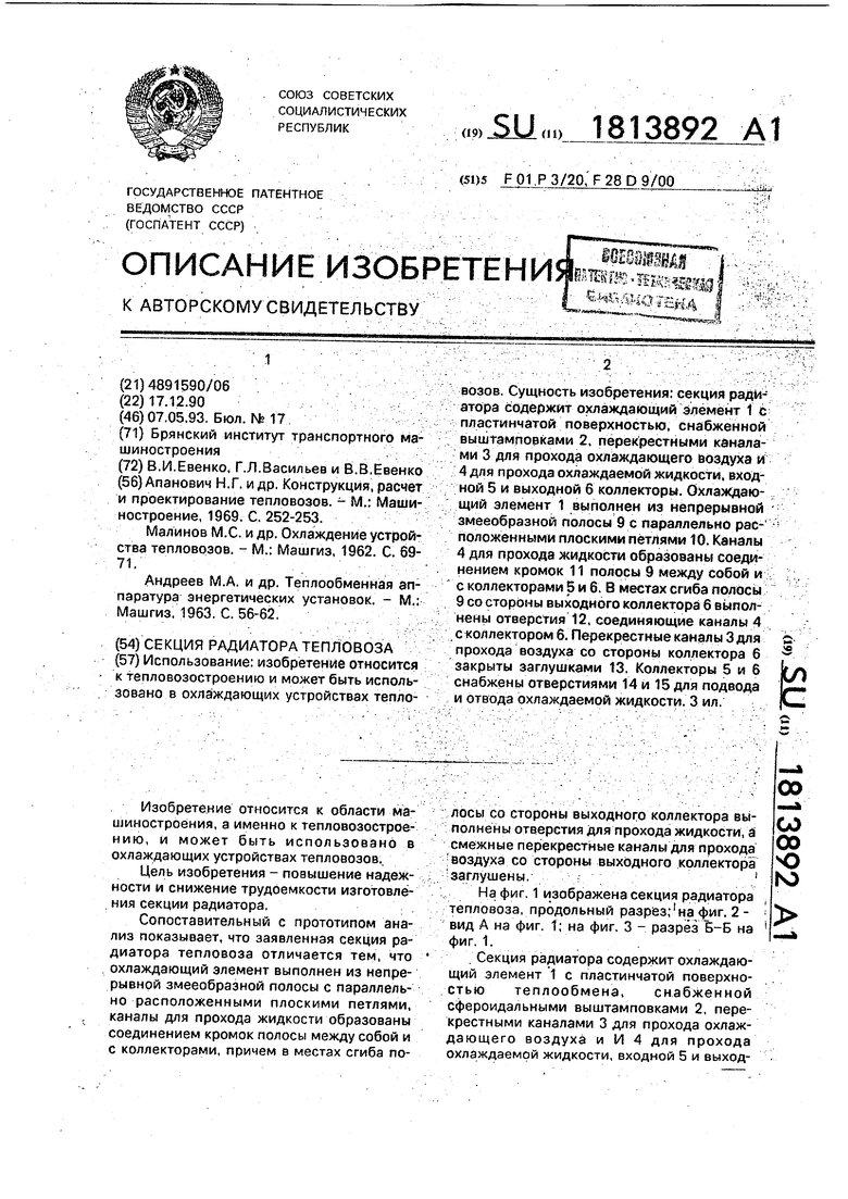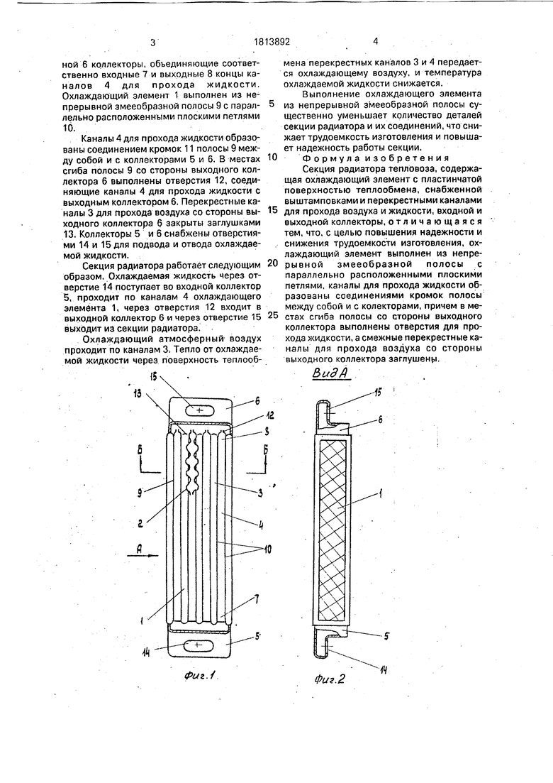 Сопоставительный с прототипом анализ показывает, что заявленная секция радиатора тепловоза отличается тем, что охлаждающий элемент выполнен из непрерывной змееобразной полосы с параллельно расположенными плоскими петлями, каналы для прохода жидкости образованы соединением кромок полосы между собой и с коллекторами, причем в местах сгиба полосы со стороны выходного коллектора выполнены отверстия для прохода жидкости, а смежные перекрестные каналы для прохода воздуха со стороны выходного коллектора заглушены. На фиг. 1 изображена секция радиатора тепловоза, продольный разрез; на фиг. 2 - вид А на фиг. 1; на фиг. 3 -. разрез Б-Б на фиг. 1. .