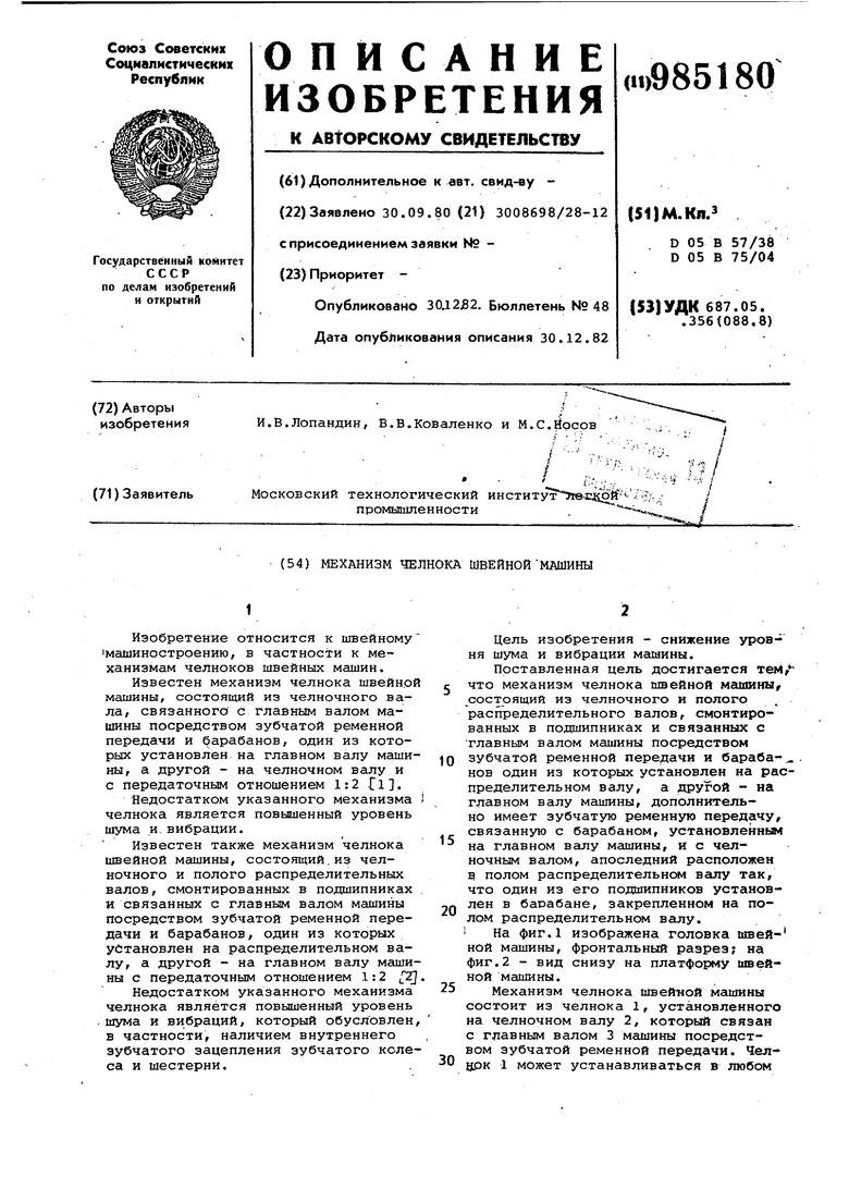 Поставленная цель достигается тем, что механизм челнока швейной мгшшны, состоящий из челночного и полого распределительного валов, смонтированных в подшипниках и связанных с главным валом машины посредством зубчатой ременной передачи и бараба10нов один из которых установлен на распределительном валу, а другой - на главном валу машины, дополнительно имеет зубчатую ременную передачу, связанную с барабаном, установленньм