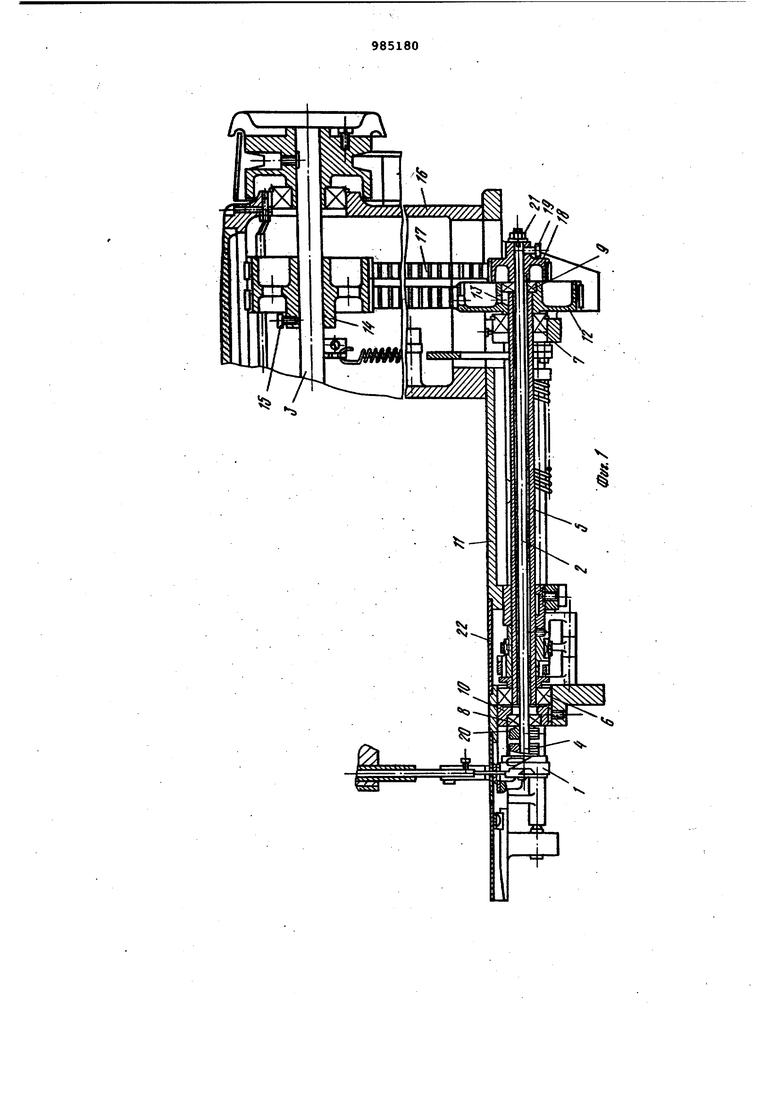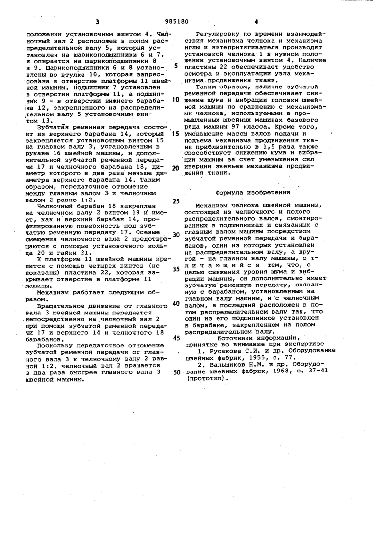 Механизм челнока швейной мгшшны состоит из челнока 1, установленного на челночном валу 2, который связан с главным валом 3 машины посредством зубчатой ременной передачи. Чел30цок 1 может устанавливаться в любом положении установочным винтом 4. Че ночный вал 2 расположен в полом рас пределительном валу 5, который установлен на шарикоподшипники б и 7, и опирается на шарикоподшипники 8 и 9. Шарикоподшипники б и 8 у :тановлены во втулке Ю, которая эапресcoBciHa в отверстие платформы 11 шве ной машины. Подшипник 7 установлен в отверстии платфо вл 11, а подшипник 9 - в отверстии нижнего бараба1на 12, закрепленного на распредели,тельном валу 5 установочным винтом 13, Зубчатая ременная передача состо ит из верхнего барабана 14, который закрепляется установочным винтом 15 на главном валу 3, установленным в рукаве 16 швейной машины, и дополнительной зубчатой ременной передачи 17 и челночного барабана 18, диаметр которого в два раза меньше ди аметра верхнего барабана 14, Таким образом, передаточное отношение между главным валом 3 и челночным валом 2 равно 1:2, Челночный барабан 18 закреплен на челночном валу 2 винтом 19 и име ет, как и верхний барабан 14, профилированную поверхность под зубчатхто ременную передачу 17 Осевые смещения челночного вала 2 предотвр щаются с помощью установочного коль ца 20 и гайки 21, К платформе 11 швейной машины кр пится с помощью четырех винтов (не показаны) пластина 22, которая закрывает отверстие в платформе 11 машины. Механизм работает следующим образом. Вращательное движение от главног вала 3 швейной машины передается непосредственно на челночный вал 2 при помощи зубчатой ременной переда чи 17 и верхнего 14 и челночного 18 барабанов, .Поскольку передаточное отношение зубчатой ременной передачи от главного вала 3 к челночному валу 2 рав ной 1:2, челночный вал 2 вращается в два раза быстрее главного вала 3 швейной машины. Регулировку по времени взаимодействия механизма челнока и механизма иглы и нитепритягивателя производят установкой челнока 1 в нужном положении установочным винтом 4, Наличие пластины 22 обеспечивает удобство осмотра и эксплуатации узла механизма продвижения ткани. Таким образом, наличие зубчатой ременной передачи обеспечивает снижение шума и вибрации головки швейной машины по сравнению с механизмами челнока, используемыми в промышленных швейных машинах базового ряда машины 97 класса. Кроме того, уменьшение массы валов подачи и подъема механизма продвижения ткани приблизительно в 1,5 раза также способствует снижению шума и вибрации машины за счет уменьшения сил инерции звеньев механизма продви кения ткани. Формула изобретения Механизм челнока швейной машины, состоящий из челночного и полого распределительного валов, смонтированных в подшипниках и связанных с главным валом машины посредством зубчатой ременной передачи и барабанов, бдин из которых установлен на распределительном валу, а другой - на главном валу машины, о тличающийся тем, что, с целью снижения уровня шума и вибрации машины, он дополнительно имеет зубчатую ременную передачу, связанную с барабаном, установленным на главном валу машины, и с челночным валом, а последний расположен в полом распределительном валу так, что один из его подшипников установлен в барабане, закрепленном на полом распределительном валу. Источники информации, принятые во внимание пр