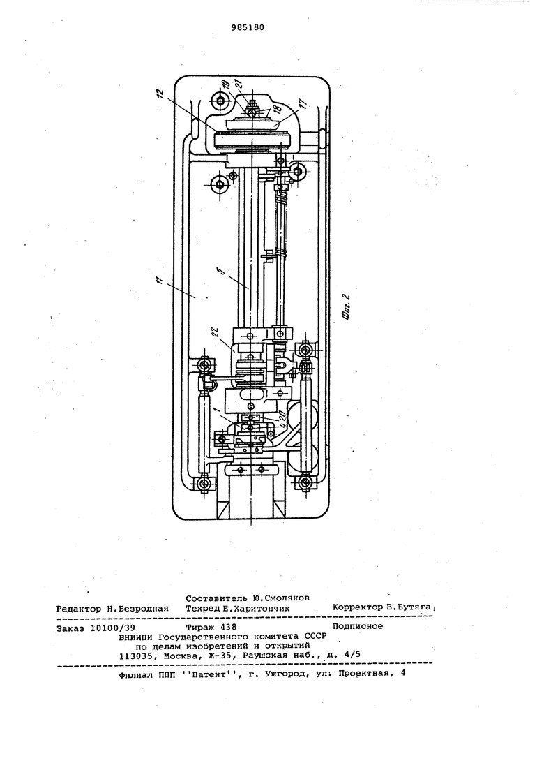 15 на главном валу машины, и с челночным валом, апоследний расположен В полом распределительном вгшу так, что один из его подшипников установлен в барабане, закрепленном на по20лом распределительном валу. На фиг.1 изображена головка швейной машины, фронтальный разрез; на фиг.2 - вид снизу на платформу швейной машины.